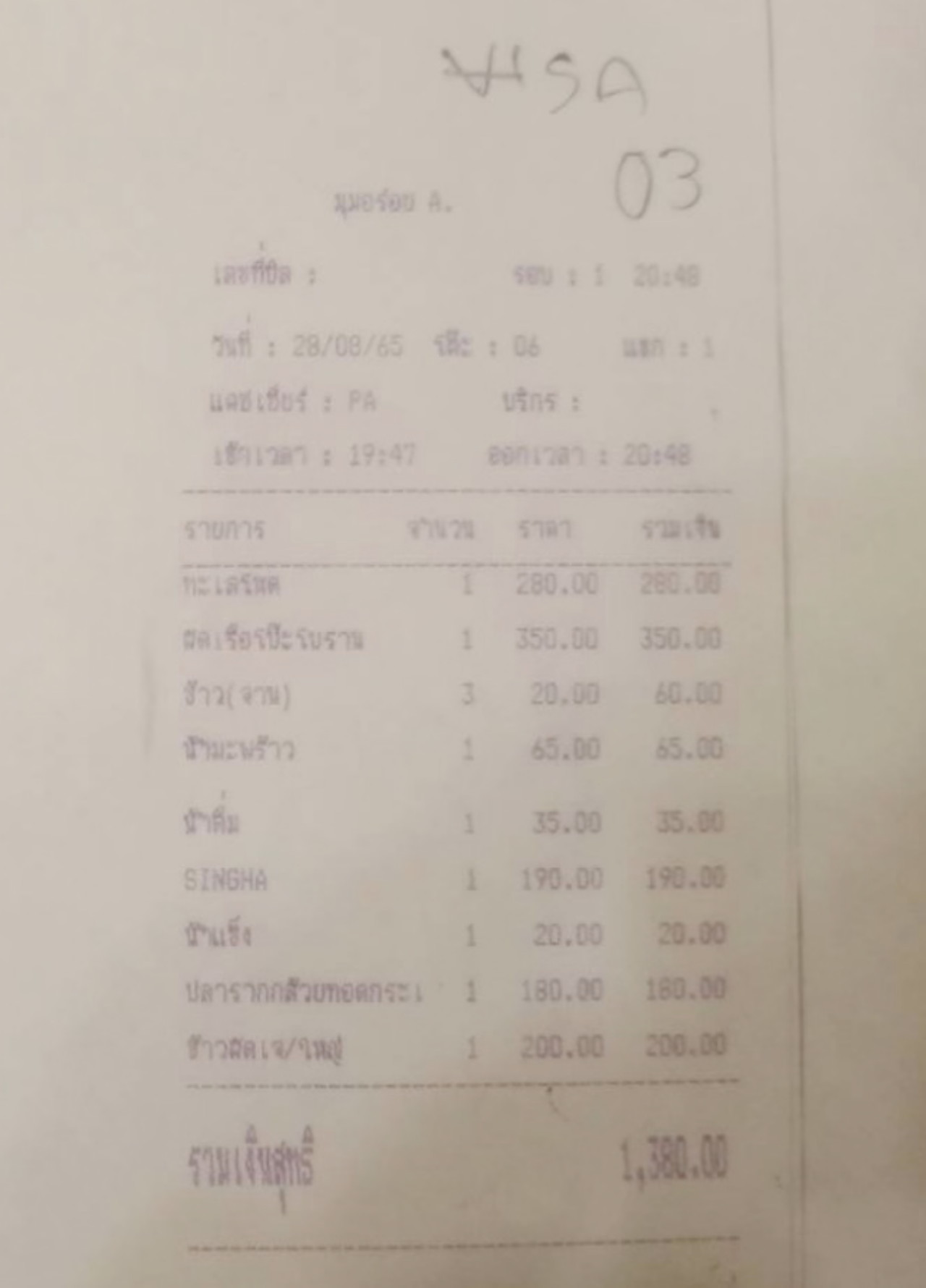 และตอนเช็กบิลก็ให้ลูกค้าตรวจรายการอาหารที่สั่งว่าตรงหรือไม่ หรือเกินหรือขาดอะไร ทางลูกค้าก็ไม่ทักท้วงก่อนจ่ายเงินแล้วก็เดินทางออกจากร้านกลับไป