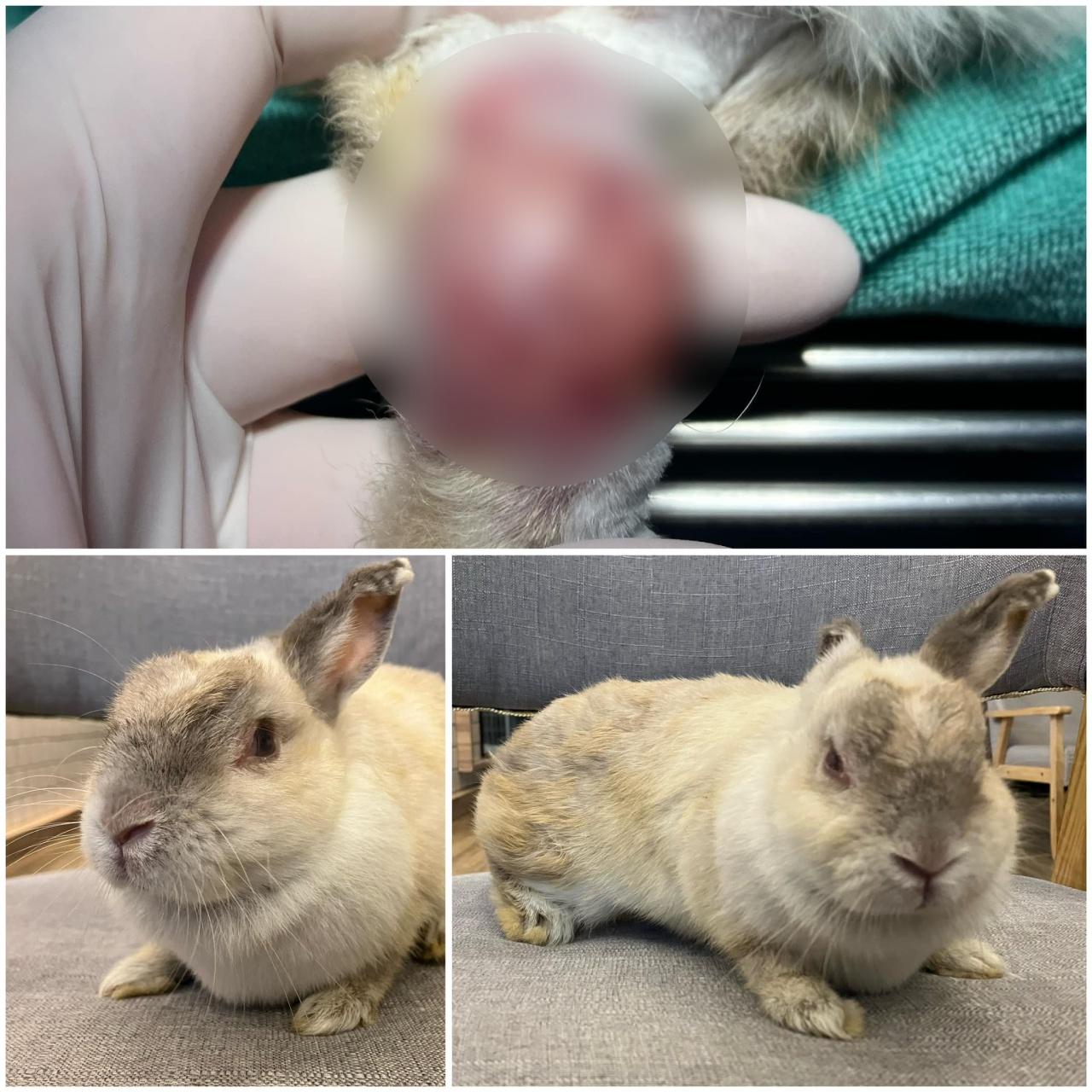 สืบเนื่องมาจาก กระต่ายตัวนี้ มีคุณแม่พามาพบคุณหมอ ด้วยปัญหาก้อนเนื้อที่ขาหลัง และสภาพที่ชรามาก คุณหมอจึงรีบนำไปตรวจเช็ก เพื่อประเมินการลุกลามของก้อนเนื้อ และค่าเลือดต่างๆ จึงให้คุณแม่นั่งรอที่โถงของโรงพยาบาล เมื่อคุณหมอตรวจเสร็จ ก็เลยจะไปคุยกับคุณแม่เพื่อวางแผนการรักษา