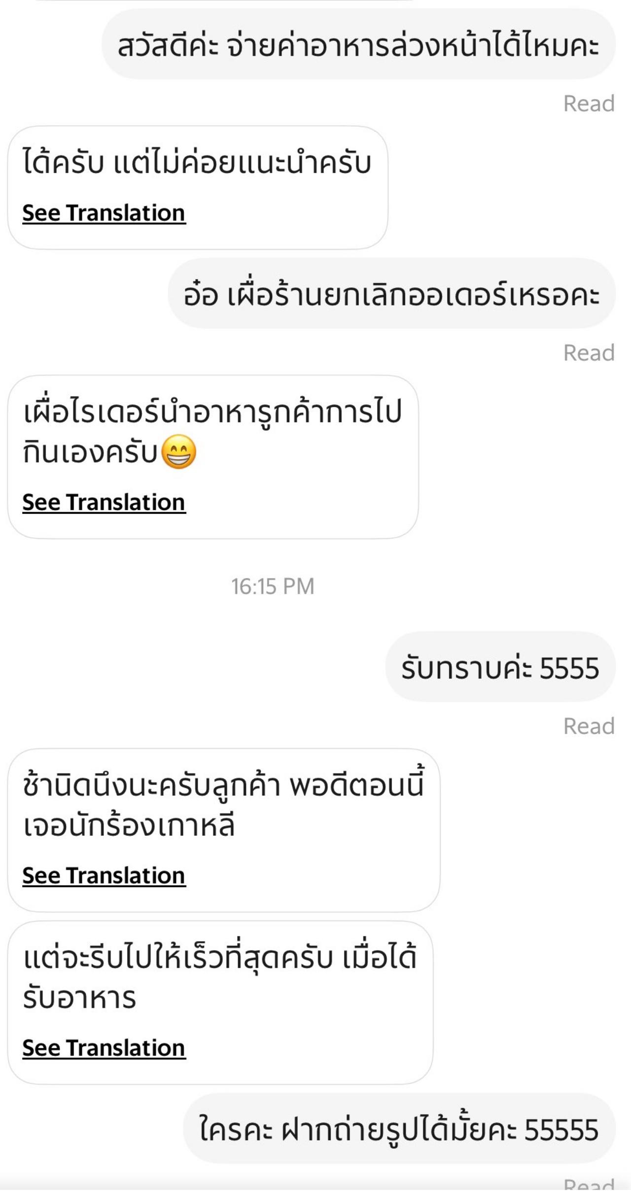 เจ้าของทวีตเริ่มต้นบทสนทนา โดยการสอบถามว่า สามารถจ่ายค่าอาหารล่วงหน้าได้ไหม ทางไรเดอร์ก็ตอบกลับว่า ได้แต่ไม่แนะนำ สาวสงสัยจึงถามไปว่าทำไม เผื่อร้านยกเลิกออเดอร์หรือ แต่คำตอบที่ได้กลับมา ทำเอาขำกลิ้ง เพราะไรเดอร์ตอบมาว่า “เผื่อไรเดอร์เอาอาหารลูกค้า ไปกินเองครับ”