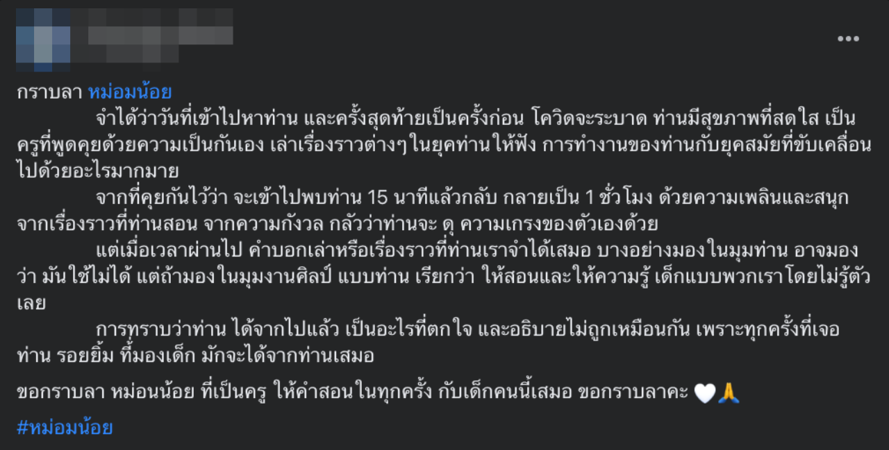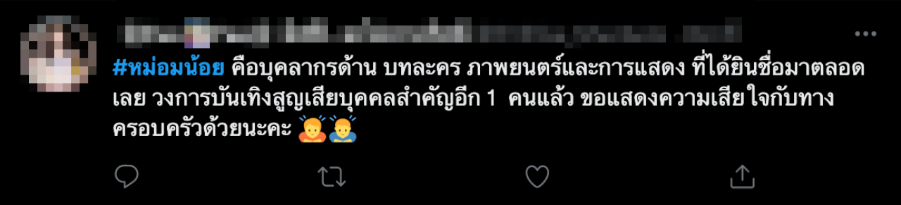 ทั้งนี้ หลังจากที่คนในโซเชียล คนในวงการบันเทิง รวมถึงผู้ที่เคยร่วมงานกับหม่อมน้อย ทราบข่าวการเสียชีวิต มีการโพสต์ข้อความแสดงความอาลัย พร้อมติดแฮชแท็ก #หม่อมน้อย