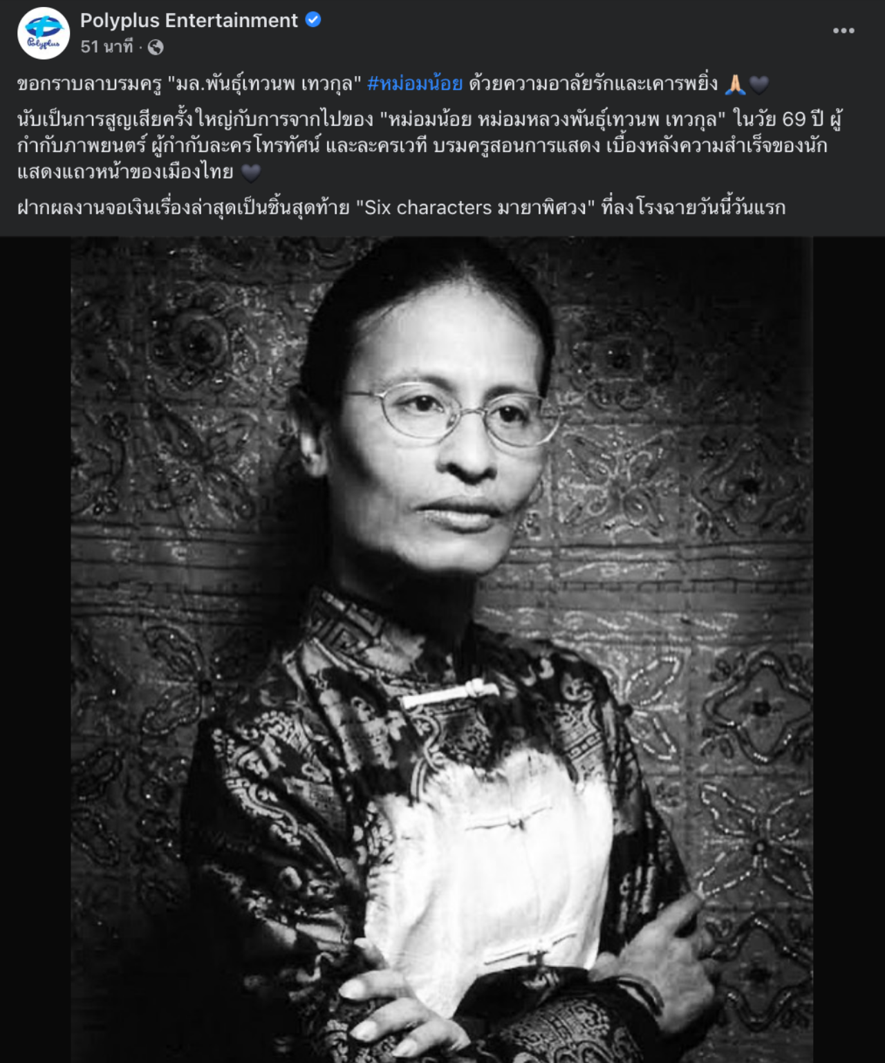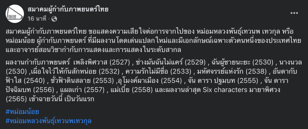 คนในโลกโซเชียลอาลัย "หม่อมน้อย" หม่อมหลวงพันธุ์เทวนพ เทวกุล ในวัย 69 ปี ผู้กำกับภาพยนตร์ บรมครูสอนการแสดง ที่สำคัญคนหนึ่งของเมืองไทย เสียชีวิตอย่างสงบ