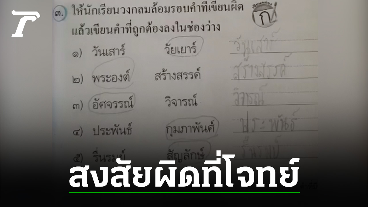 พร้อมแนะนำว่า ถ้าเปลี่ยนคำถามเป็น "ให้นักเรียนวงกลมคำที่เขียนผิด แล้วแก้ไขคำในวงกลมให้ถูกต้อง ลงในช่องว่าง" แบบนี้น่าจะดีกว่าไหม หรือเปลี่ยนเป็น "ทำเครื่องหมายวงล้อมรอบคำที่เขียนไม่ถูกต้อง พร้อมเขียนแก้ไขคำนั้นให้ถูกต้อง ลงในช่องว่างที่กำหนด"