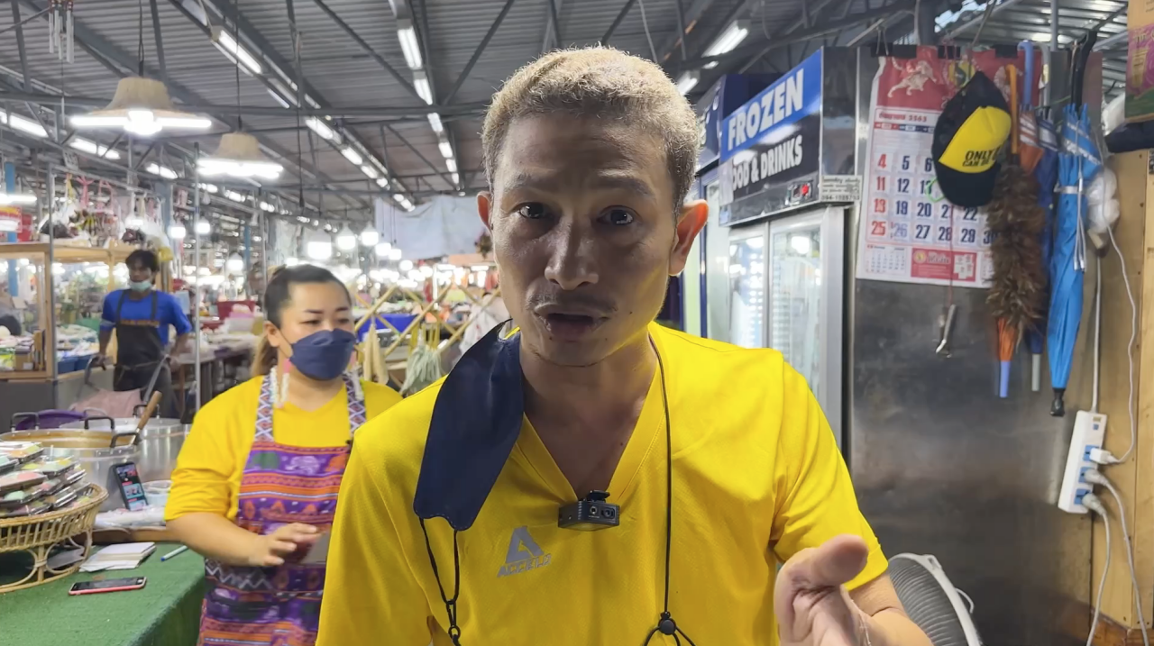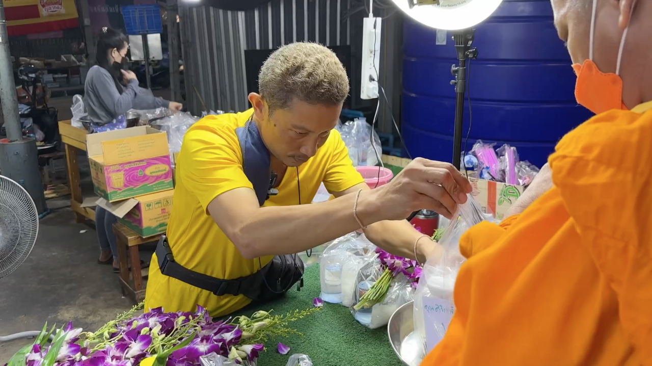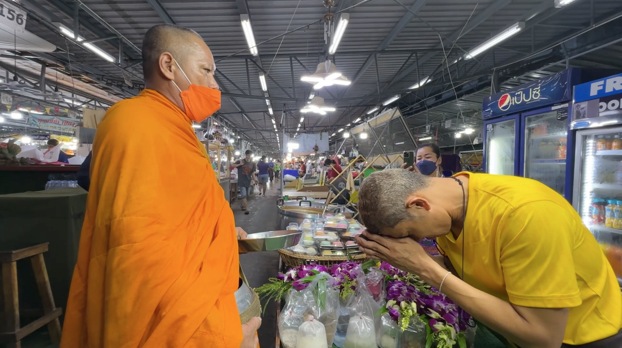 นายวรพงศ์ อายุ 45 ปี เจ้าของรานข้าวแกงเฮียโก๋ เปิดเผยว่า ตนเปิดร้านขายข้าวแกงใส่บาตรที่ตลาดแห่งนี้มาเกือบ 9 ปี เมื่อเดือนที่แล้วตนไลฟ์สดอยู่ ลูกค้าถามตนว่าทำอะไร ตนเลยบอกว่ากำลังทำกับข้าวใส่บาตรส่งพ่อค้าแม่ค้าในตลาดบางฆ้อง ลูกค้าเลยขอฝากทำบุญด้วย เพราะต้องดูแลแม่ที่ป่วยติดเตียง ไม่สามารถออกมาทำบุญได้
