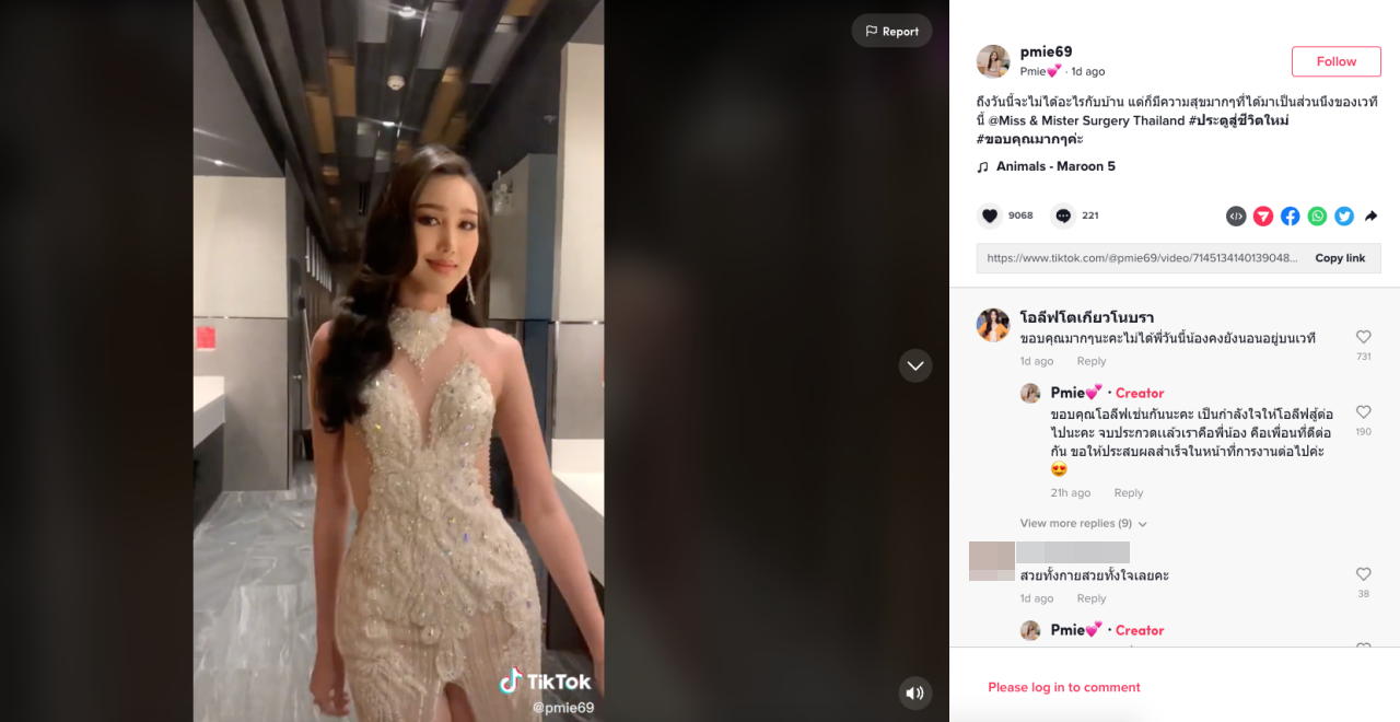 อย่างไรก็ตาม จากการตรวจสอบพบว่า สาวคนดังกล่าวคือ "น้องพูมมี่" หนึ่งในผู้เข้าประกวด Miss & Mister Surgery Thailand 2022 เป็นนางงามสาวสองที่เคยได้รับตำแหน่ง ธิดาศาลตายาย จ.สุพรรณ 2560 เทพีบั้งไฟพญานาคโลก 2563 โดยจากเหตุการณ์ดังกล่าว ทำให้ชาวเน็ตได้เข้าไปแสดงความคิดเห็น พร้อมให้กำลังใจ "น้องโอลีฟ" และชื่นชมการกระทำของ "น้องพูมมี่" เป็นจำนวนมาก.