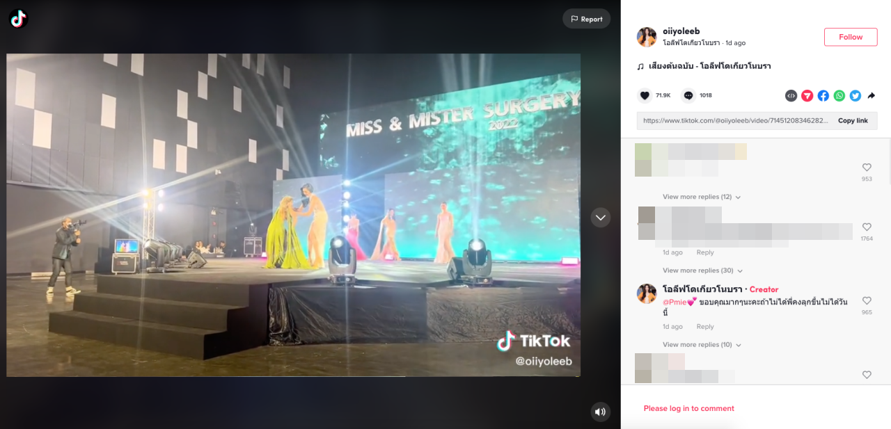 จากกรณีโลกโซเชียล มีการแชร์คลิปภาพนาทีที่ "โอลีฟ โตเกียวโนบรา" หรือ โอลีฟ โตเกียวเนยกรอบ แม่ค้าสาวเน็ตไอดอล ที่เข้าร่วมประกวด Miss & Mister Surgery Thailand 2022 ซึ่งระหว่างที่เดินโชว์ตัวในชุดราตรีนั้น โอลีฟ กลับสะดุดล้มลงกลางเวที ก่อนจะมีเพื่อน ผู้เข้าร่วมประกวดรายหนึ่ง เข้ามาพยุงให้ลุกขึ้นอย่างทุลักทุเล ส่งผลให้ไม่ได้เข้ารอบ 10 คนสุดท้ายในการประกวดครั้งนี้
