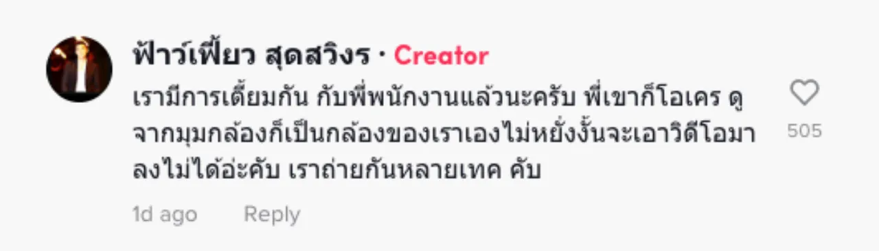 หลังจากมีการชี้แจงแล้ว พบว่ายังมีบางส่วนยังคงไม่พอใจ โดยระบุว่า จะเตี๊ยมหรือไม่เตี๊ยมก็ไม่ควรทำ เป็นคอนเทนต์ที่ไม่สร้างสรรค์เลย รบกวนพนักงานเขาด้วย อย่างไรก็ตาม คลิปดังกล่าวได้มีการลงเมื่อวันที่ 25 กันยายน ที่ผ่านมา โดยมีคนเข้ามาดูกว่า 1.3 ล้านครั้ง.