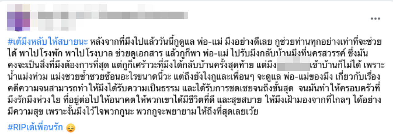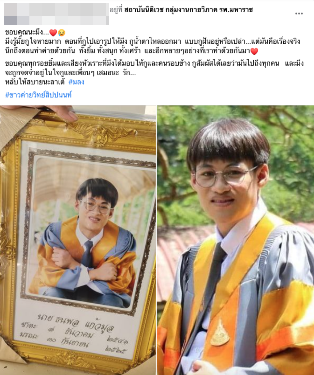 ทั้งนี้ จากการตรวจสอบเฟซบุ๊กของ นายธนพล แก้วมูล หรือ น้องเต้ ผู้เสียชีวิต พบว่ามีเพื่อนเข้ามาโพสต์ภาพพร้อมข้อความแสดงความไว้อาลัยต่อการจากไปต่อ บัณฑิตเกียรตินิยมคนเก่ง กันเป็นจำนวนมาก.