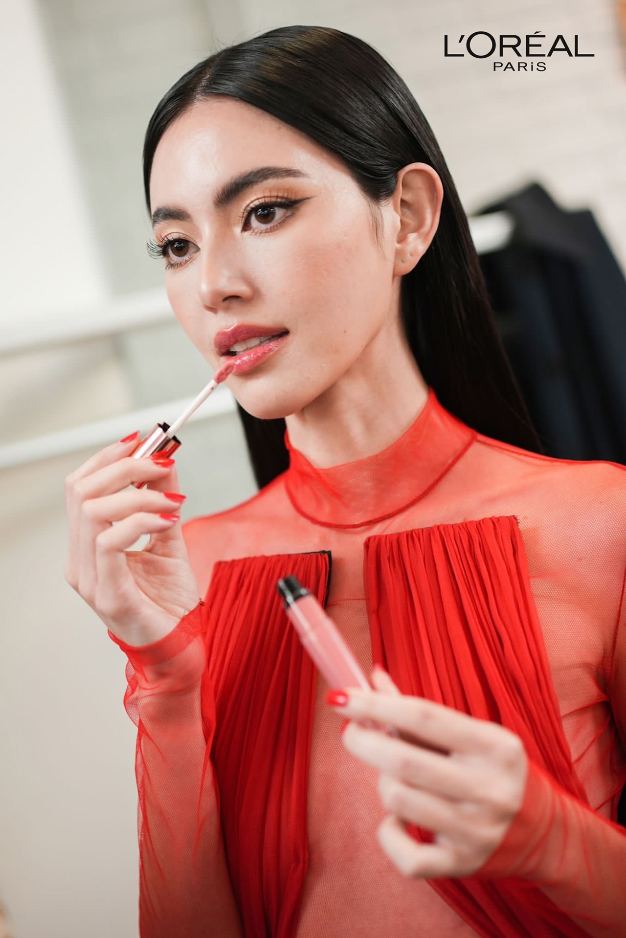 ใหม่ ดาวิกา โฮร์เน่ ปรากฏตัวในชุดสีแดงทั้งตัว จากแบรนด์ Burc Akyol เติมเต็ม Look สุดเฉี่ยวด้วย รองพื้น Infallible 24H Matte Cover Foundation แต่งแต้มงานตาด้วย Air Volume Mega Mascara Easy Waterproof และ Flash Cat Eye eyeliner ปิดท้ายด้วยลิปสติกจาก Brilliant Signature Plump in Gloss สี 412 กับ Chiffon Signature สี 224 แตะเบาๆ