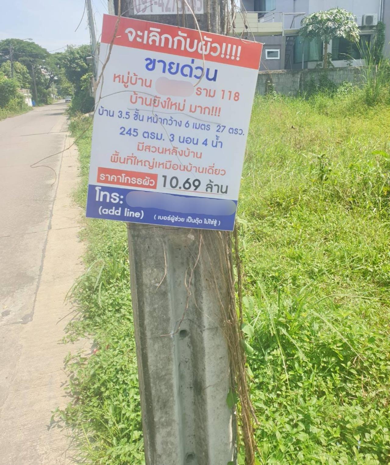 โดยในป้ายดังกล่าวนั้นระบุข้อความว่า "จะเลิกกับผัว ขายด่วน บ้านยังใหม่มาก บ้าน 3.5 ชั้น หน้ากว้าง 6 เมตร 27 ตรว. 245 ตรม. 3 นอน 4 น้ำ มีสวนหลังบ้าน พื้นที่ใหญ่เหมือนบ้านเดี่ยว ราคาโกรธผัว 10.69 ล้าน พร้อมทั้งแจ้งเบอร์ติดต่อไว้ ทิ้งท้ายว่า เบอร์ผู้ช่วยเป็นตุ๊ด ไม่ใช่ชู้"