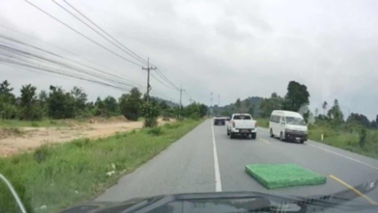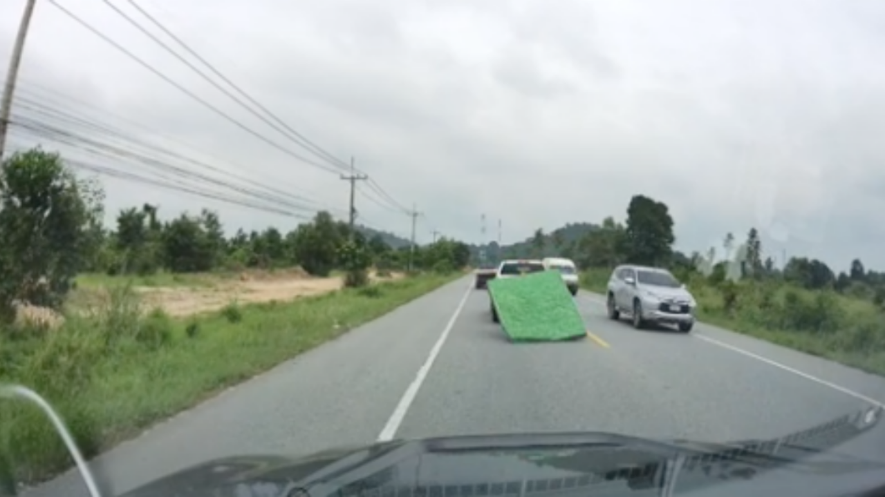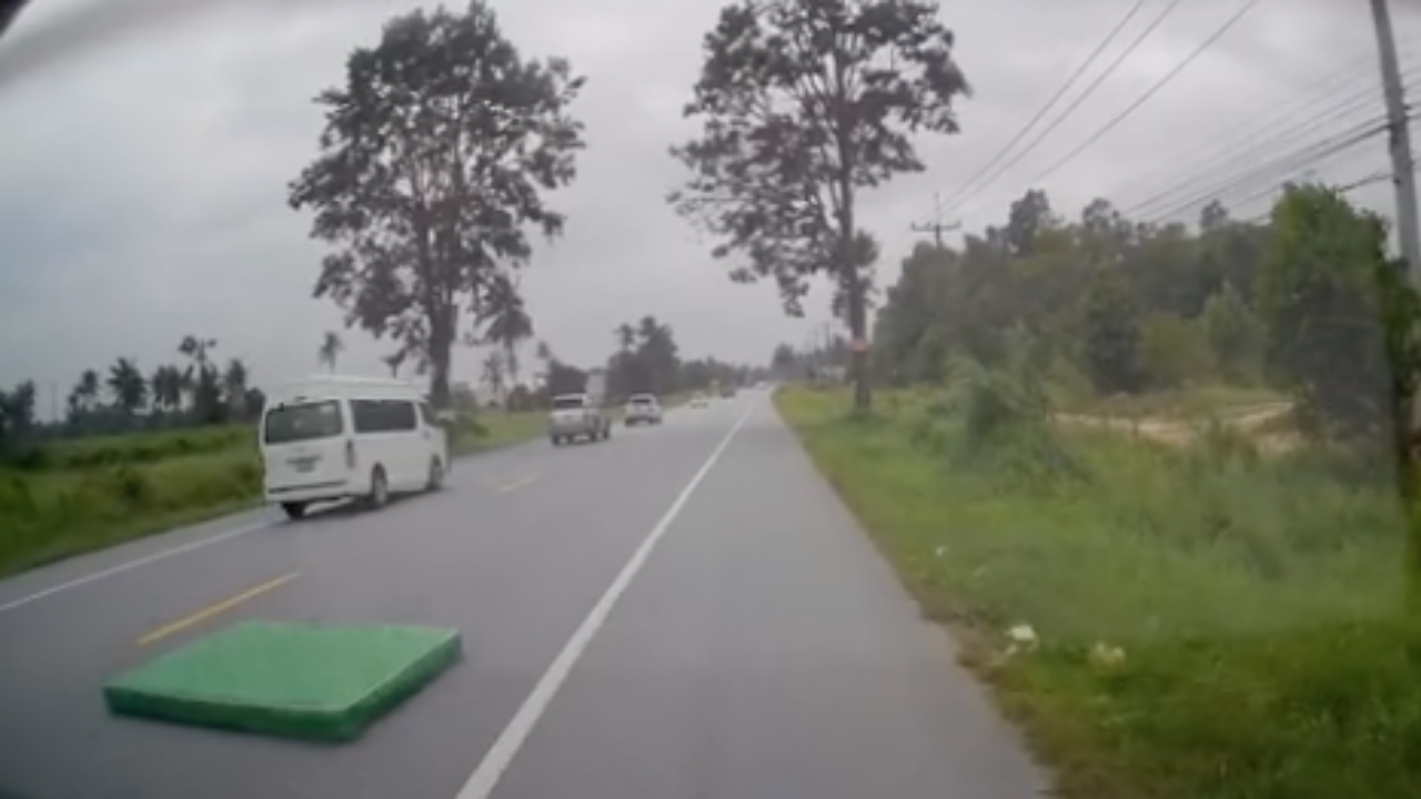 โดยมีรถกระบะสีขาวคันหนึ่งกำลังขับนำหน้า จากนั้นก็เกิดเหตุไม่คาดคิดขึ้น จู่ๆ มีฟูกที่นอนสีเขียวขนาดใหญ่ปลิวข้ามหลังคารถกระบะคันดังกล่าว ก่อนจะมาตกอยู่หน้ารถของเจ้าของคลิป แต่โชคดีที่คนขับมีสติ หักหลบทัน จึงไม่เกิดอุบัติเหตุขึ้น