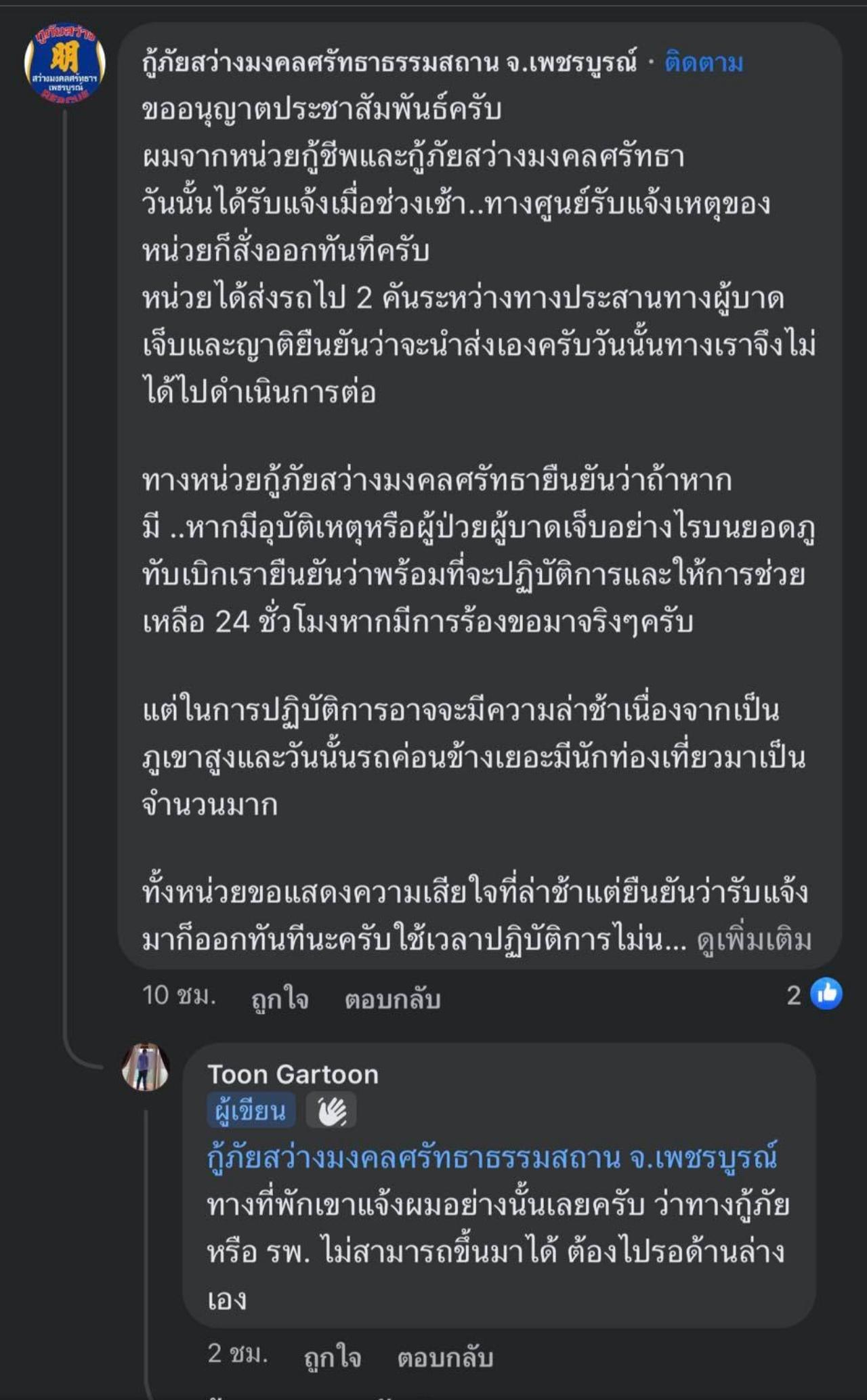 แต่ในการปฏิบัติการอาจจะมีความล่าช้า เนื่องจากเป็นภูเขาสูง และวันนั้นรถค่อนข้างเยอะ มีนักท่องเที่ยวมาเป็นจำนวนมาก ขอแสดงความเสียใจที่ล่าช้า แต่ยืนยันว่ารับแจ้งมา ก็ออกทันที ซึ่งเจ้าของโพสต์ได้ตอบกลับว่า ที่พักแจ้ง ว่าทางกู้ภัยหรือ รพ. ไม่สามารถขึ้นมาได้ ต้องไปรอด้านล่าง