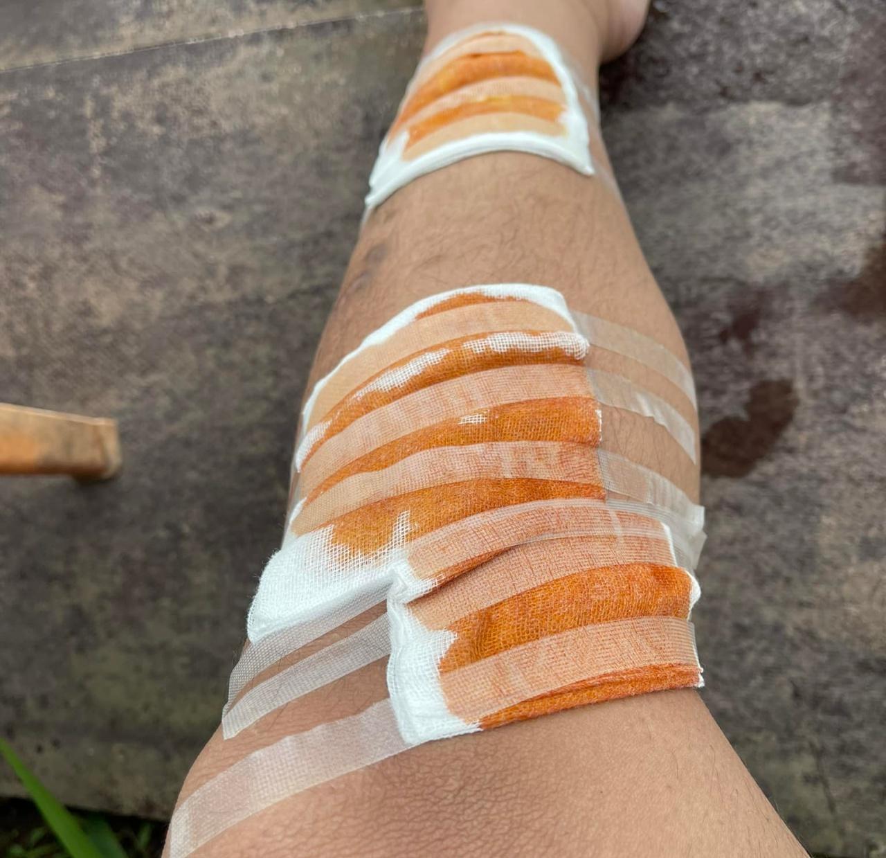 เช้ารุ่งขึ้น 15/10/65 ได้ไปโรงพยาบาล คุณหมอทำการล้างบาดแผล ขูดผิวหนังที่ตายออก และเย็บเนื้อที่หลุดห้อย (ประมาณ 3 ตร.ซ.) 6 เข็ม ฉีดยาบาดทะยัก 1 เข็ม คุณหมอให้หยุดพัก 5 วัน ค่ารักษาหมดไป 8,727 ต้องล้างแผลทุกวัน วันละ 400 เป็นเวลา 7 วัน ถึงจะตัดไหม ตัดไหมอีกประมาณ 3,000-4,000 บาท
