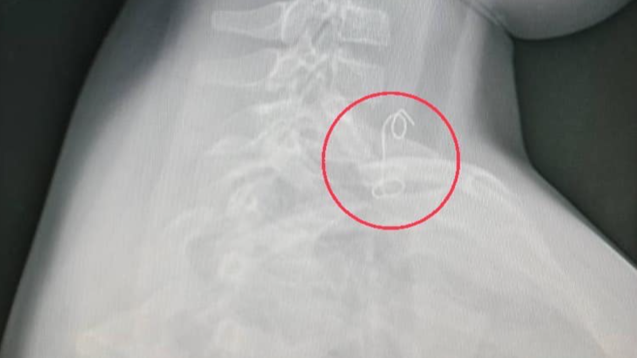 แพทย์ห้องฉุกเฉินส่งเอกซเรย์ เห็นเป็นวัตถุคล้ายขดลวดติดอยู่บริเวณส่วนต้นหลอดอาหาร ปรึกษาแพทย์ผู้เชี่ยวชาญด้านหู คอ จมูก เปิดห้องผ่าตัดด่วน ต้องดมยาสลบวิธีพิเศษ ใส่ท่อช่วยหายใจทางจมูก เพื่อป้องกันไม่ให้สำลักระหว่างผ่าตัด ใช้เครื่องมือส่องกล้องคีบเอาสิ่งแปลกปลอมออกมาได้