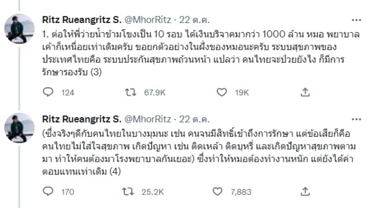 ซึ่งหมอริทได้แสดงความคิดเห็นหลายทวิต ซึ่งมีประเด็นหนึ่ง ที่ถึงระบบสาธารณสุขของไทยระบุว่า "ระบบสุขภาพของประเทศไทย คือ ระบบประกันสุขภาพถ้วนหน้า แปลว่า คนไทยจะป่วยยังไง ก็มีการรักษารองรับ ซึ่งจริงๆ ดีกับคนไทยในบางมุมนะ เช่น คนจนมีสิทธิ์เข้าถึงการรักษา