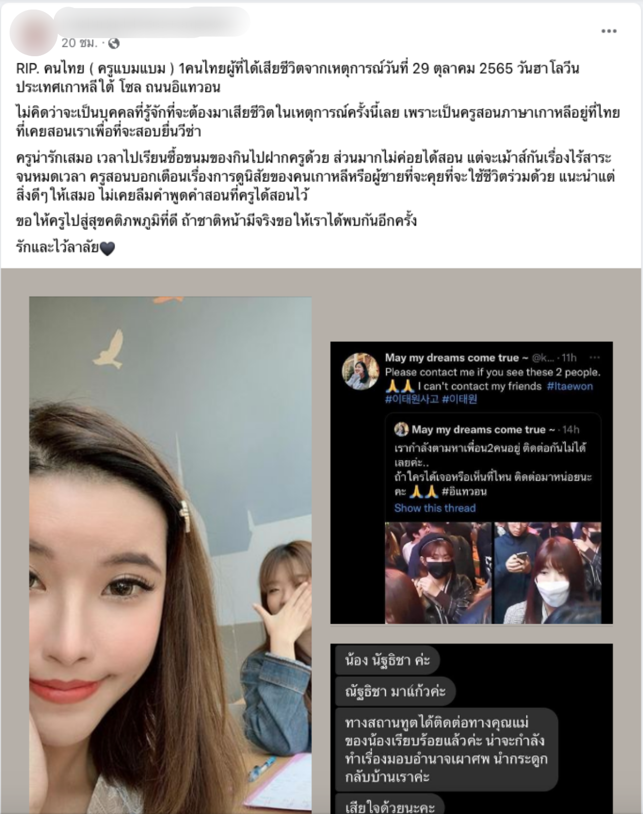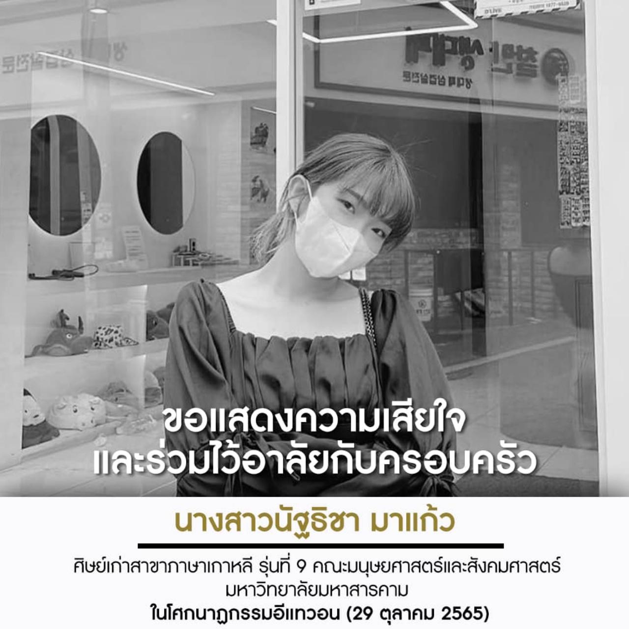 สุดเศร้า โซเชียลร่วมแสดงความอาลัย "น้องแบม" ศิษย์เก่ามหาวิทยาลัยมหาสารคาม สาวไทยที่เสียชีวิตจากเหตุสลด งานฮาโลวีนอิแทวอน
