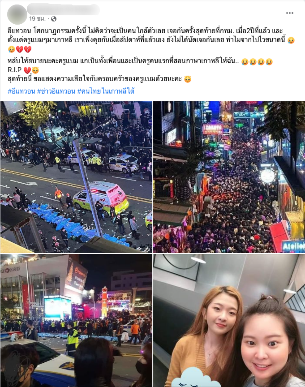 ทั้งนี้ ยังมีลูกศิษย์ที่เคยได้เรียนภาษาเกาหลีกับผู้เสียชีวิต เมื่อทราบข่าวก็ได้โพสต์ไว้อาลัย แสดงความเสียใจกับเหตุการณ์ที่เกิดขึ้น และเล่าถึงความประทับใจที่ได้พบกับครู ก่อนขออวยพรให้ผู้เสียชีวิตไปสู่สุคติในภพภูมิที่ดี
