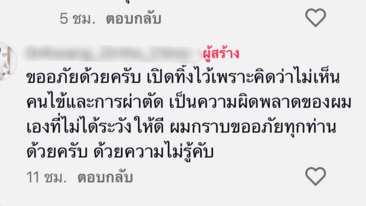 ต่อมาคุณหมอเจ้าของคลิปได้ออกมาขอโทษ ระบุว่า ขออภัยด้วยครับ เปิดทิ้งไว้เพราะคิดว่าไม่เห็นคนไข้ และการผ่าตัด เป็นความผิดพลาดของผมเอง ที่ไม่ระวังให้ดี ผมขอกราบขออภัยทุกท่านด้วยครับ ด้วยความไม่รู้