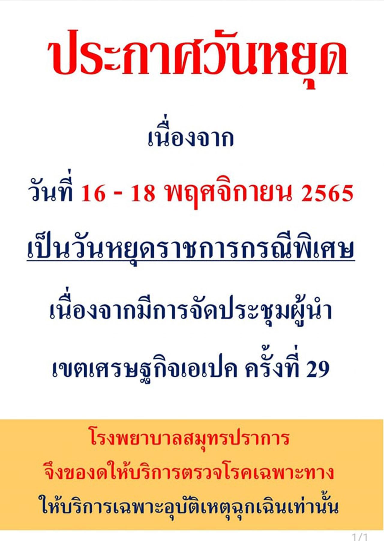 วันที่ 6 พฤศจิกายน 2565 ผู้สื่อข่าวรายงานว่า กลายเป็นประเด็นที่ถูกพูดถึงในโลกออนไลน์ เมื่อแฟนเพจ เฟซบุ๊ก FM91 Trafficpro ได้โพสต์ภาพประกาศของโรงพยาบาลสมุทรปราการ พร้อมระบุว่า ประกาศจาก รพ.สมุทรปราการ เนื่องในกรณีวันหยุดราชการกรณีพิเศษ ในวันที่ 16-18 เดือนพฤศจิกายน 2565 เนื่องจากมีการจัดประชุมผู้นำเขตพิเศษเอเปก ครั้งที่ 29 โรงพยาบาลของดให้บริการตรวจโรคเฉพาะทาง และจะให้บริการเฉพาะอุบัติเหตุฉุกเฉินเท่านั้น