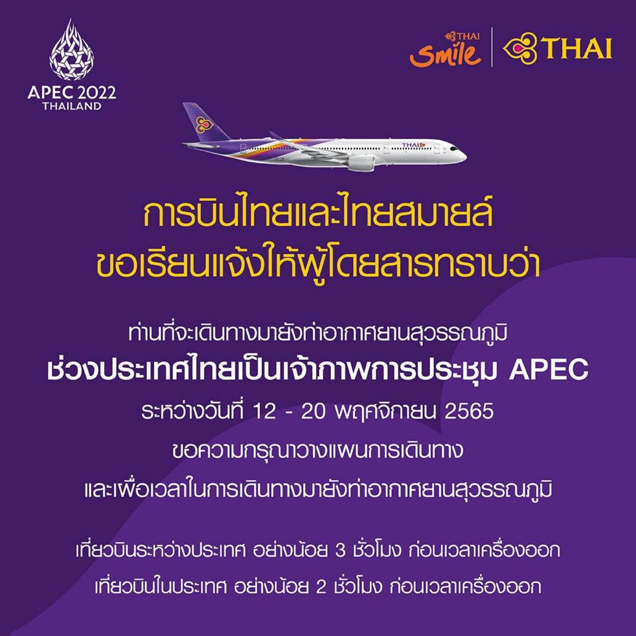 ทั้งนี้ ทางแฟนเพจ Thai Airways ได้โพสต์ข้อความว่า การบินไทยและไทยสมายล์ ขอเรียนแจ้งให้ผู้โดยสารทราบว่า ท่านที่จะเดินทางมายังท่าอากาศยานสุวรรณภูมิ ช่วงประเทศไทยเป็นเจ้าภาพการประชุม APEC ระหว่างวันที่ 12-20 พฤศจิกายน 2565 ขอความกรุณาวางแผนการเดินทาง และเผื่อเวลาในการเดินทางมายังท่าอากาศยานสุวรรณภูมิ