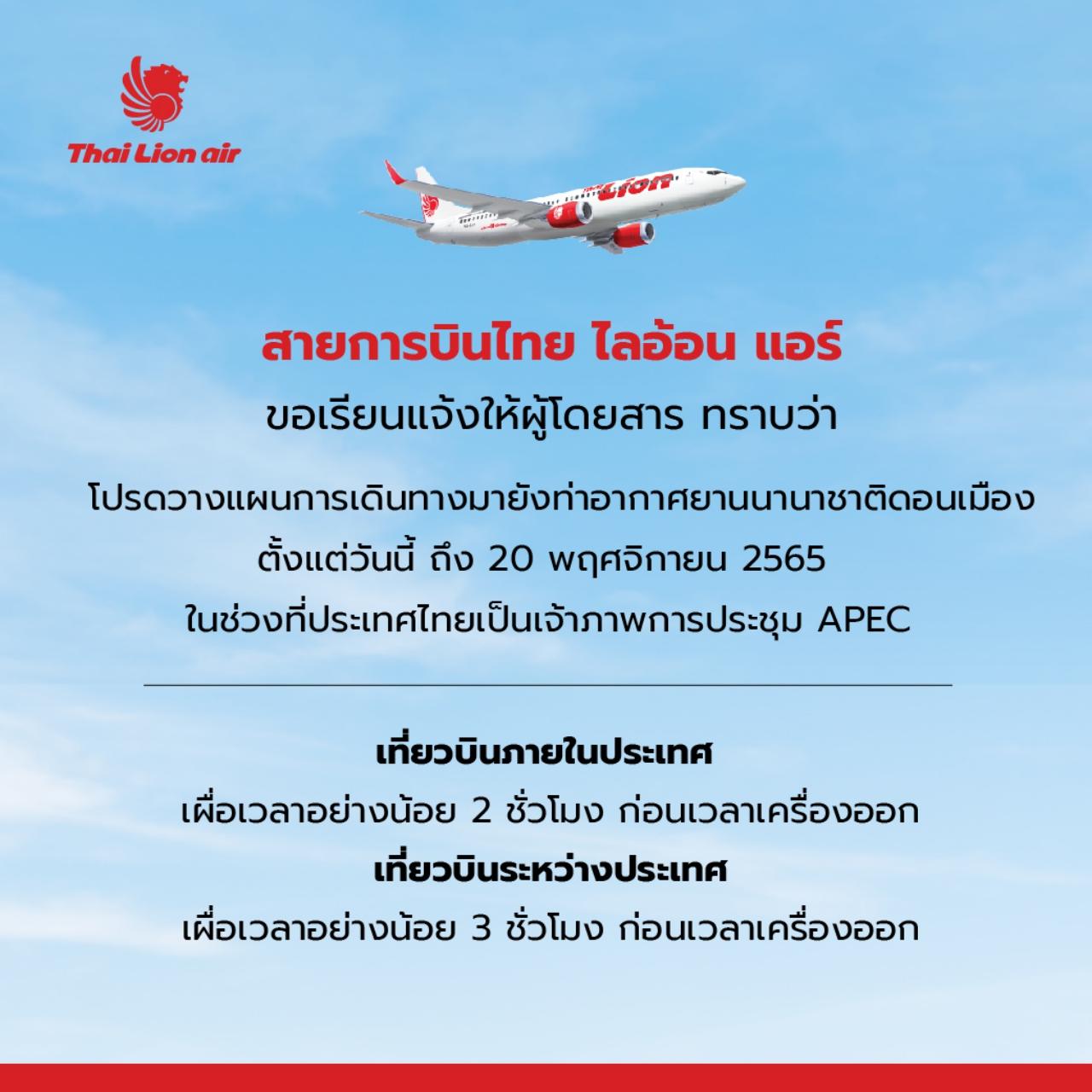 แฟนเพจ Thai Lion Air แจ้งว่า สายการบินไทย ไลอ้อน แอร์ ขอเรียนแจ้งให้ผู้โดยสาร ทราบว่า โปรดวางแผนการเดินทางมายังท่าอากาศยานนานาชาติดอนเมือง ตั้งแต่วันนี้ ถึง 20 พฤศจิกายน 2565 ในช่วงที่ประเทศไทยเป็นเจ้าภาพการประชุม APEC