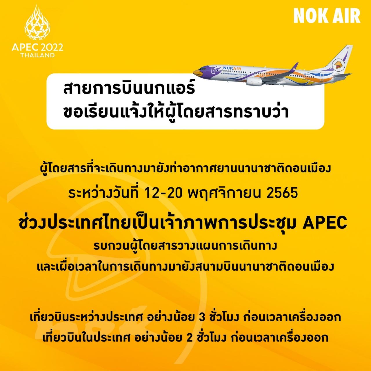 เช่นเดียวกับ แฟนเพจ Nok Air แจ้งว่า สายการบินนกแอร์ ขอเรียนแจ้งให้ผู้โดยสารทราบว่า ผู้โดยสารที่จะเดินทางมายังท่าอากาศยานนานาชาติดอนเมือง ระหว่างวันที่ 12-20 พฤศจิกายน 2565 ช่วงประเทศไทยเป็นเจ้าภาพการประชุม APEC รบกวนผู้โดยสารวางแผนการเดินทางและเผื่อเวลาในการเดินทางมายังสนามบินนานาชาติดอนเมือง