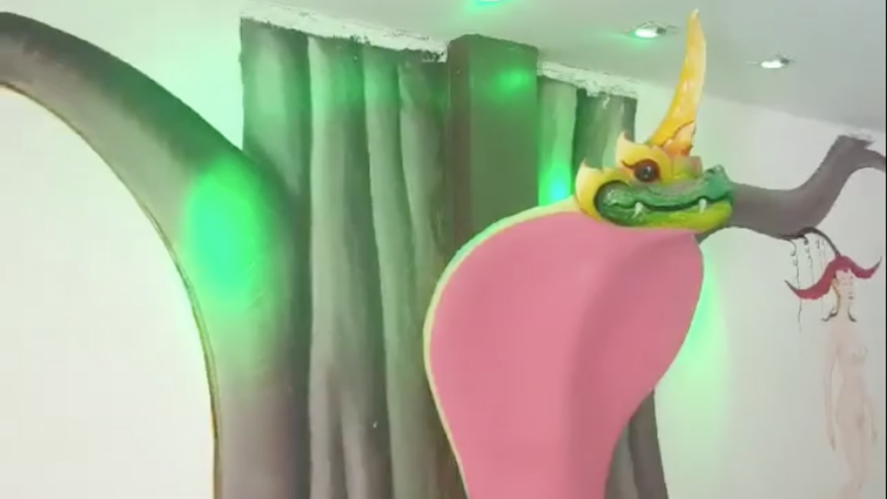 วันที่ 14 พฤจิกายน 2565 ผู้สื่อข่าวรายงานว่า กลายเป็นไวรัลฮาในโลกออนไลน์ เมื่อผู้ใช้เฟซบุ๊ก ชื่อ Pruit Phonyiam ได้โพสต์ภาพท้องพักแห่งหนึ่งใน จ.มหาสารคาม ที่ภายในเต็มไปด้วยการตกแต่งแปลกตา มีทั้งหิ้งพระ ภาพวาดผนังที่มีต้นโพธิ์ขนาดใหญ่ มักกะลีผล และหัวพญานาคใหญ่ที่ตั้งอยู่บนหัวเตียง โดยมีลำตัวและหางพันอยู่รอบขาเตียง พร้อมระบุข้อความว่า เมื่อคืนนอนที่นี่จริงๆ หรอ แล้วดูดีไซน์