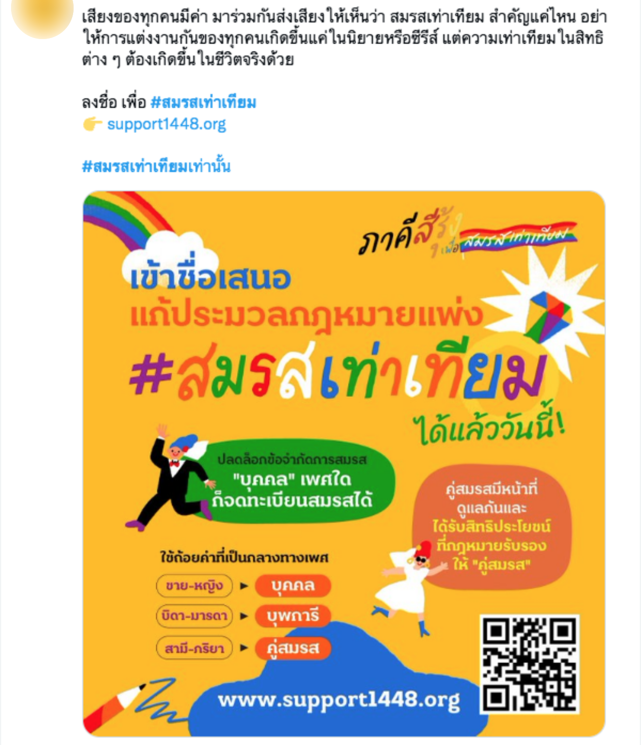 ทำให้โลกออนไลน์ โดยเฉพาะในทวิตเตอร์ แห่ติดแอชแท็ก #สมรสเท่าเทียมเท่านั้น ขึ้นเทรนด์ทวีตต่อเนื่อง เพื่อจับตาการพิจารณาร่างกฎหมาย และทิศทางการลงคะแนนเสียงสภาในครั้งนี้.