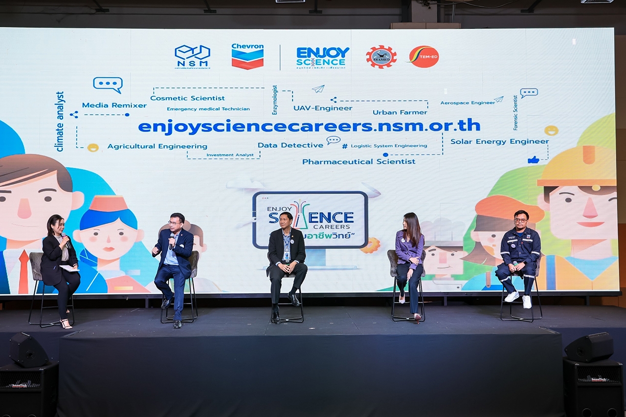 นางสาวพรสุรีย์ กอนันทา รองประธานกรรมการบริหาร ฝ่ายกิจการองค์กร บริษัท เชฟรอนประเทศไทยสำรวจและผลิต จำกัด กล่าวว่า “นิทรรศการ Enjoy Science Careers: สนุกกับอาชีพวิทย์ เป็นหนึ่งในกิจกรรม ภายใต้โครงการ “Chevron Enjoy Science: สนุกวิทย์ พลังคิด เพื่ออนาคต” ที่เชฟรอนได้ดำเนินงานตามแนวทาง ‘รัฐร่วมเอกชน’ มีเป้าหมายเพื่อยกระดับการศึกษาในสาขาสะเต็มทั้งสายสามัญและอาชีพทั่วประเทศอย่างเป็นรูปธรรม ผ่านการพัฒนาครู การปรับปรุงหลักสูตร และจัดหาอุปกรณ์การเรียนการสอนให้นักเรียนและนักศึกษาเข้าใจกระบวนการผ่านการลงมือปฏิบัติจริง ตลอดจนจัดกิจกรรมส่งเสริมการเรียนรู้นอกห้องเรียนต่างๆ เพื่อปลูกฝังหัวใจรักในการเรียนรู้ด้านสะเต็มแก่เยาวชน เนื่องจากเล็งเห็นถึงความสำคัญของการพัฒนาพลังคนในสาขาสะเต็ม อันเป็นรากฐานในการขับเคลื่อนประเทศไทยสู่สังคมแห่งเทคโนโลยีและนวัตกรรม โดยที่ผ่านมา เชฟรอนได้ร่วมมือกับ อพวช. ในการจัด นิทรรศการ Enjoy Science Careers: สนุกกับอาชีพวิทย์ มาตั้งแต่ปี 2559 และเพื่อต่อยอดการสร้างแรงบันดาลใจให้ในอาชีพสะเต็มให้กับเยาวชนในวงกว้าง ในปีนี้เราจึงร่วมมือกับ อพวช. และ SEAMEO STEM-ED ปรับรูปแบบเป็นนิทรรศการออนไลน์แทนการจัดกิจกรรม on-site ในรูปแบบเดิม เพื่อปลดล็อคข้อจำกัดในการเข้าถึงการเรียนรู้ของเด็กๆ ในบางพื้นที่ เป็นการขยายโอกาสในการเรียนรู้ และเตรียมความพร้อมสำหรับการประกอบอาชีพในสาขาสะเต็มให้เป็นที่รู้จักในวงกว้างยิ่งขึ้น”