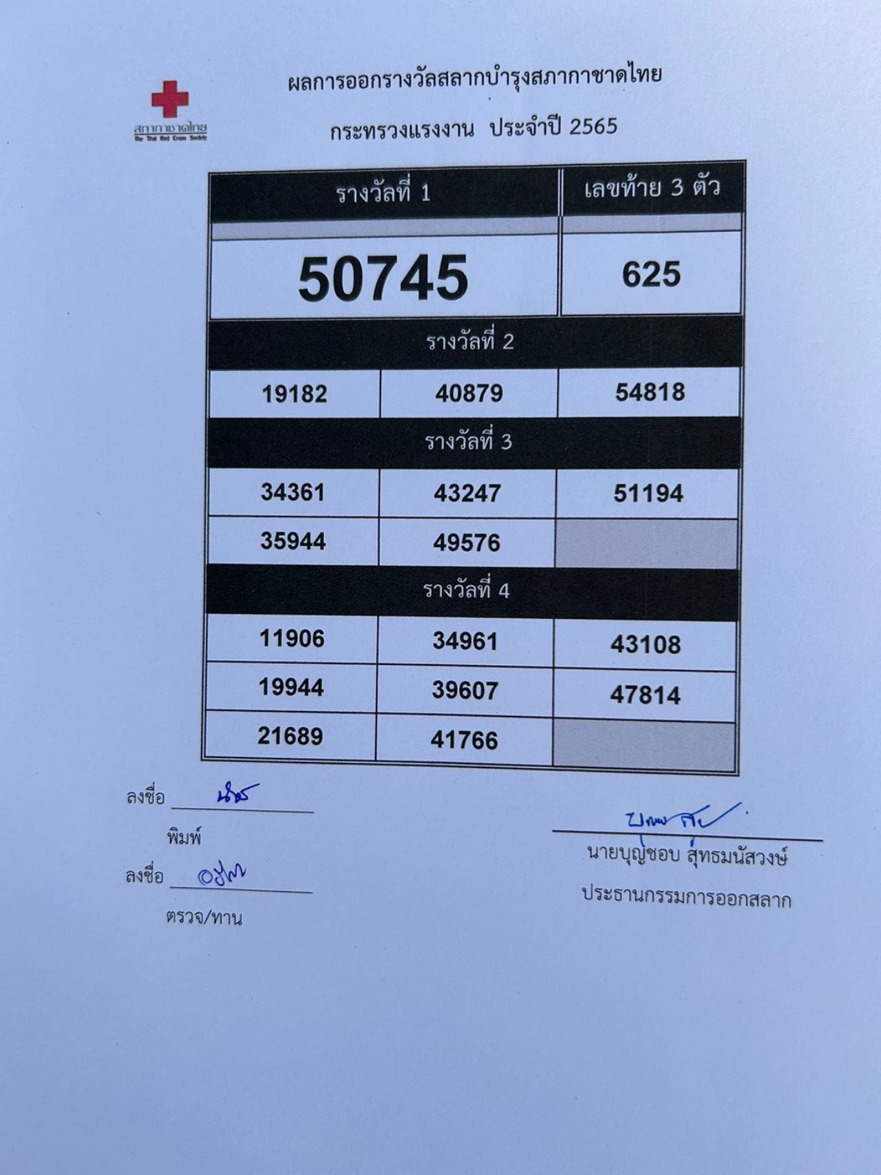 สำหรับผลการออกรางวัลสลากกาชาดไทย "บัตรแรงงานเชิญรับโชค" กระทรวงแรงงาน ประจำปี 2565 มีดังนี้