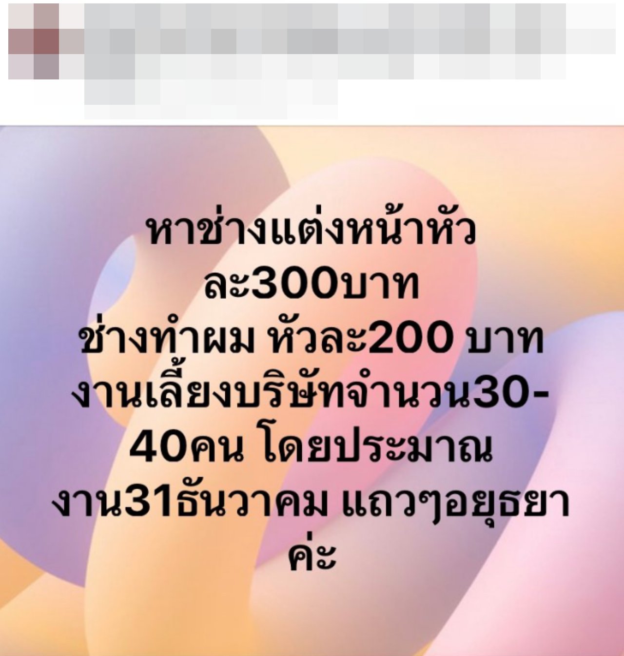 วันที่ 23 ธ.ค.65 จากกรณีผู้ใช้เฟซบุ๊กรายหนึ่ง ได้เข้าไปโพสต์ข้อความในกลุ่ม "หาช่างแต่งหน้า-ทำผม สำหรับงานถ่ายแบบ งานพิธี รับปริญญา งานแต่ง งานอิเว้นท์ฯ" ระบุ "ตามหา หาช่างแต่งหน้าหัวละ 300 บาท ช่างทำผม หัวละ 200 บาท งานเลี้ยงบริษัทจำนวน 30-40 คน โดยประมาณ งาน 31 ธันวาคม แถวๆ อยุธยาค่ะ"