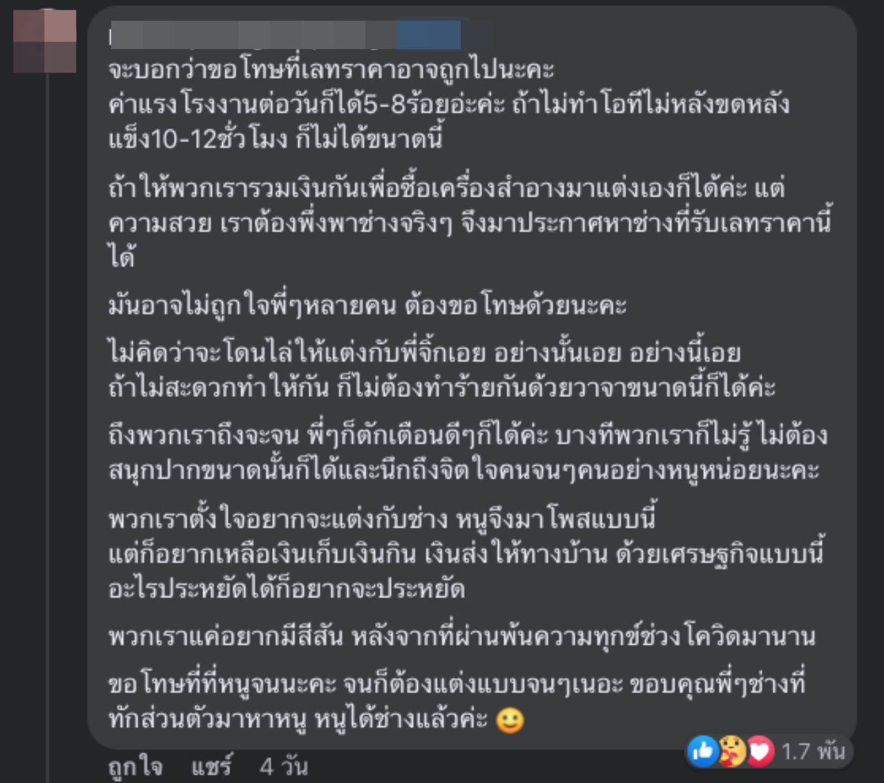 ถึงพวกเราถึงจะจน พี่ๆ ก็ตักเตือนดีๆ ก็ได้ค่ะ บางทีพวกเราก็ไม่รู้ ไม่ต้องสนุกปากขนาดนั้นก็ได้ และนึกถึงจิตใจคนจนๆ คนอย่างหนูหน่อยนะคะ พวกเราตั้งใจอยากจะแต่งกับช่าง หนูจึงมาโพสต์แบบนี้ แต่ก็อยากเหลือเงินเก็บเงินกิน เงินส่งให้ทางบ้าน ด้วยเศรษฐกิจแบบนี้ อะไรประหยัดได้ก็อยากจะประหยัด พวกเราแค่อยากมีสีสัน หลังจากที่ผ่านพ้นความทุกข์ช่วงโควิดมานาน