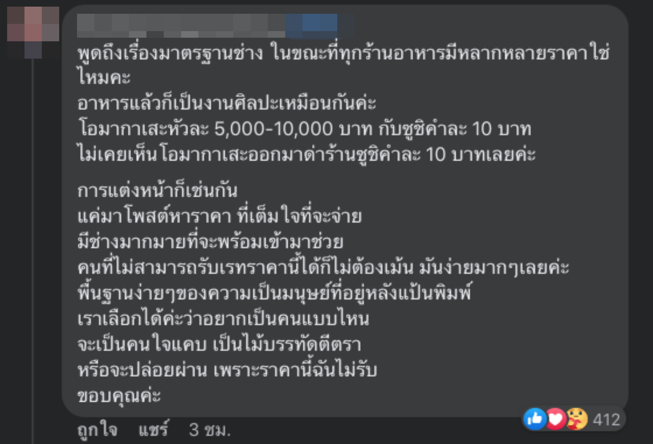 ขณะที่บางคน ได้มาอธิบายอันนี้ในส่วนของวิชาชีพช่างแต่งหน้าว่า "ทุกคนทำงานหลังขดหลังแข็ง ยิ่งช่างหน้าช่างผม ยิ่งปวดหลัง ทุกอาชีพมีต้นทุน แล้วต้นทุนเราสูงมากค่ะ ค่าเครื่องสำอางแต่ละชิ้นไม่ได้ราคาถูกค่ะ เพราะฉะนั้นเรตราคามันก็รับกับต้นทุนที่เราจ่ายไปค่ะ ค่าวิชาชีพที่ต้องอัพสกิลกันเรื่อยๆ ค่าพอร์ทที่ต้องจ้างทั้งนางแบบ ช่างผม ช่างกล้อง เช่าชุด เช่าสตู ทุกอย่างมีค่าใช้จ่ายค่ะ ที่คุณตีราคามาแบบนี้ มันก็เหมือนดูถูกวิชาชีพเราค่ะ เพราะตีค่ามาต่ำมากค่ะ"