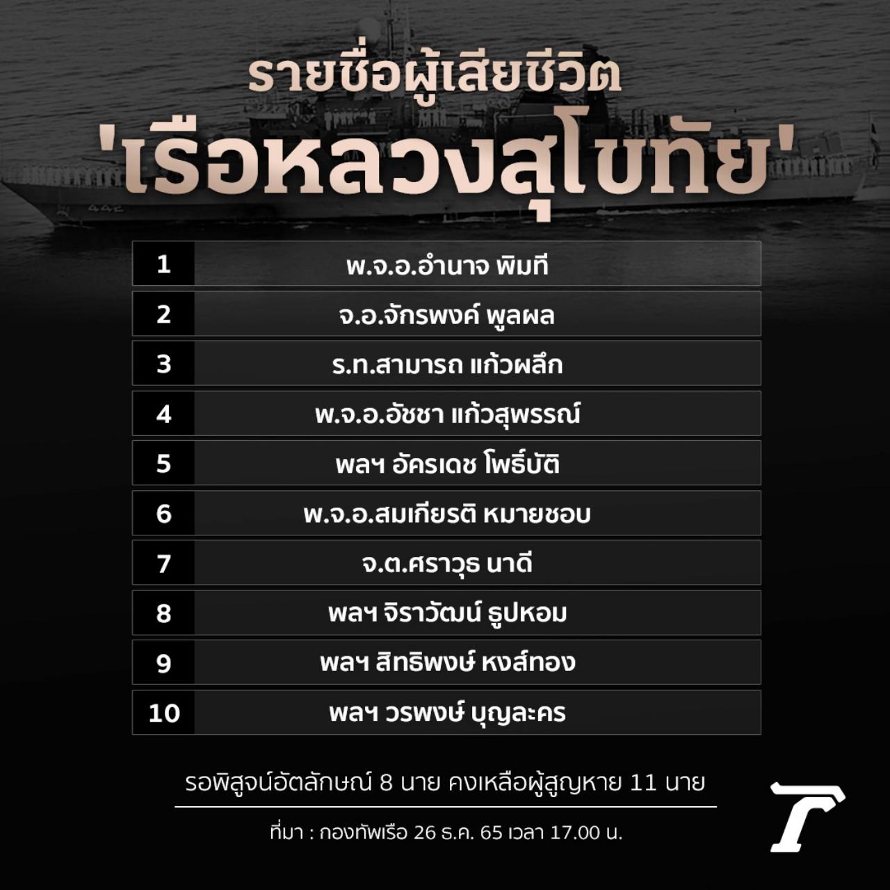 อัปเดตรายชื่อผู้เสียชีวิต จากเหตุการณ์ "เรือหลวงสุโขทัย" อับปาง เจ้าหน้าที่ยังเร่งค้นหาผู้สูญหายอีกจำนวน 11 นาย