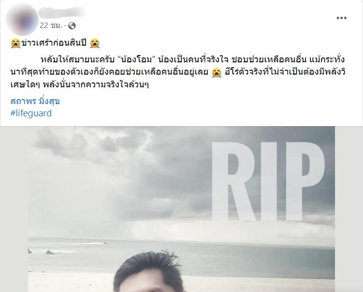 โซเชียลอาลัย "นายสถาพร มิ่งสุข" เจ้าหน้าที่ไลฟ์การ์ด น็อกหมดสติขณะลงดำน้ำช่วยค้นหา "น้องเปรี้ยวหวาน" เด็ก 10 ขวบโดนคลื่นซัดหาย ที่หาดชลาทัศน์ จ.สงขลา สุดท้ายเสียชีวิตในเวลาต่อมา
