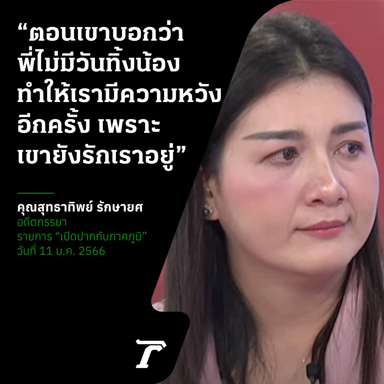 คุณสุทธาทิพย์ รักษายศ หรือครูแมว เผยว่า เราใช้ชีวิตคู่มา 15 ปี ทำไมเขาไม่เห็นความซื่อสัตย์ของเรากับเขา ในวันที่หย่ากันเพราะเขาบอกว่าจะจดกันใหม่ ก็หวังว่าทุกอย่างจะดีขึ้น เขาเป็นแฟนคนแรกและรักแรก หลังจากแต่งงานตนก็เรียนต่อ จนสุดท้ายคลอดลูกแล้วหยุดเลี้ยงลูก 1 ปี ใช้เงินพ่อแม่ทั้งหมด