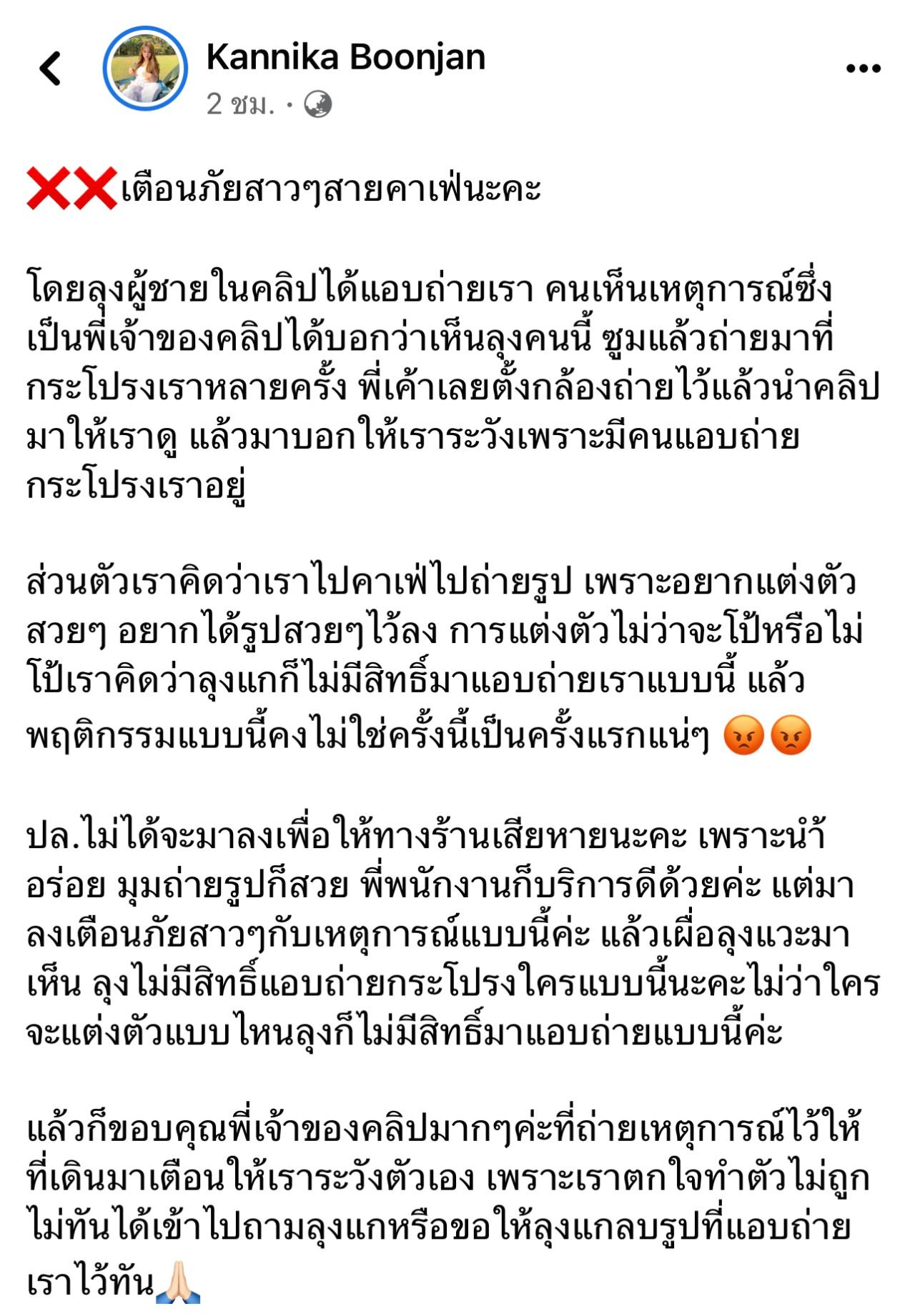 วันที่ 24 มกราคม 2566 ผู้สื่อข่าวรายงานว่า กลายเป็นเรื่องราวที่ถูกแชร์ในโลกออนไลน์ เมื่อผู้ใช้บัญชีเฟซบุ๊ก Kannika Boonjan ได้โพสต์คลิปวิดีโอเตือนภัยพร้อมระบุข้อความว่า เตือนภัยสาวๆ สายคาเฟ่นะคะ โดยลุงผู้ชายในคลิปได้แอบถ่ายเรา คนเห็นเหตุการณ์ซึ่งเป็นพี่เจ้าของคลิปได้บอกว่าเห็นลุงคนนี้ ซูมแล้วถ่ายมาที่กระโปรงเราหลายครั้ง
