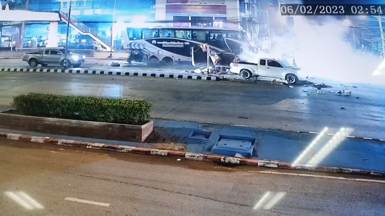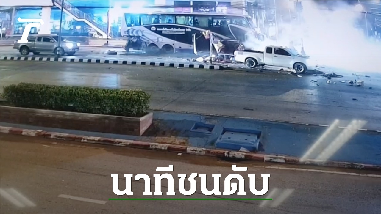 เปิดนาที คลิปจากกล้องวงจรปิด รถปิกอัพขับชนท้ายรถทัวร์พานักเรียนไปทัศนศึกษา ก่อนกระเด็นไปชนปิกอัพอีกคัน ทำให้คนในรถที่มาชน 3 คน เสียชีวิตทั้งหมด ขณะที่นักเรียนปลอดภัยทั้งหมด