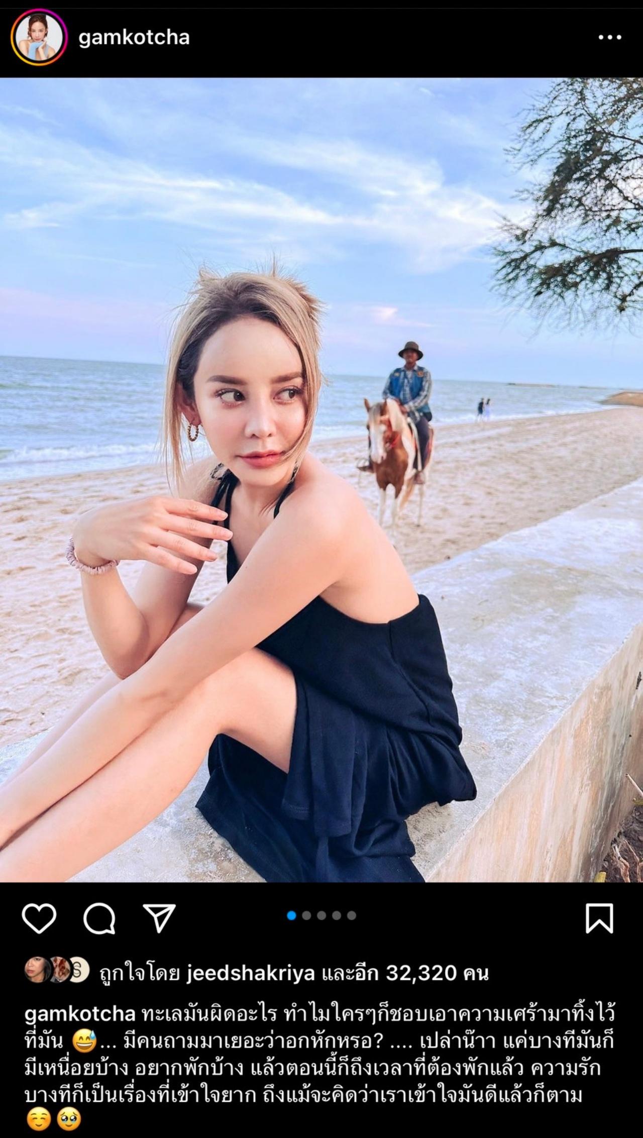 ทั้งนี้ เมื่อเข้าไปดูในอินสตาแกรมของแก้มกี้ พบว่ารูปล่าสุด เป็นภาพของตัวเองขณะนั่งอยู่ริมทะเล พร้อมแคปชั่น ระบุว่า "ทะเลมันผิดอะไร ทำไมใครๆ ก็ชอบเอาความเศร้ามาทิ้งไว้ที่มัน .. มีคนถามมาเยอะว่าอกหักหรอ? .... เปล่าน๊าา แค่บางทีมันก็มีเหนื่อยบ้าง อยากพักบ้าง แล้วตอนนี้ก็ถึงเวลาที่ต้องพักแล้ว ความรักบางทีก็เป็นเรื่องที่เข้าใจยาก ถึงแม้จะคิดว่าเราเข้าใจมันดีแล้วก็ตาม"