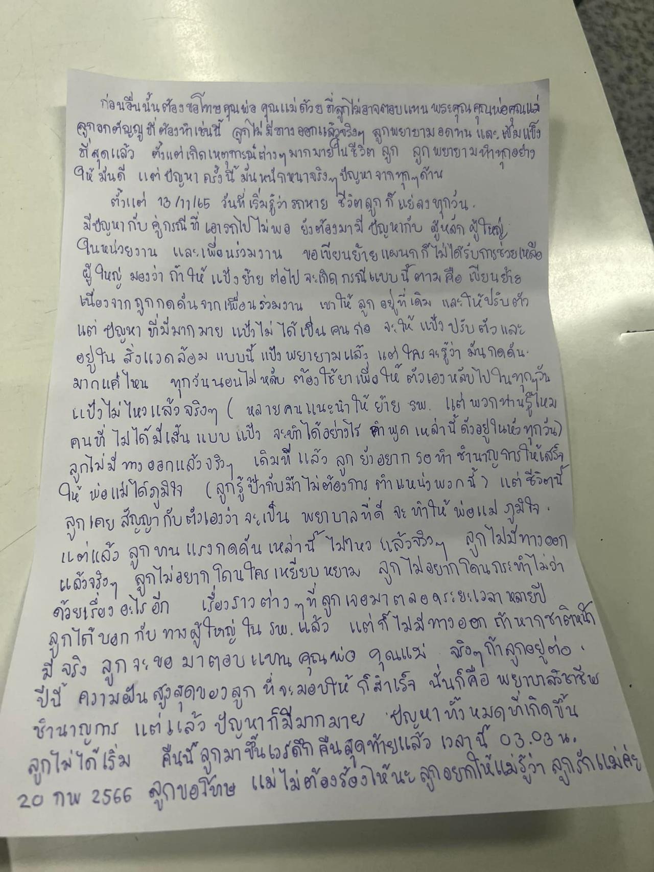 วันที่ 21 ก.พ. 2566 จากกรณีผู้ใช้เฟซบุ๊กรายหนึ่ง ซึ่งเป็นพยาบาลประจำห้องคลอดของศูนย์อนามัยที่ 1 ได้มีการเขียนจดหมาย ความยาวเต็มหน้ากระดาษ A4 ด้วยลายมือตัวเองก่อนโพสต์จดหมายตัดพ้อลงเฟซบุ๊ก โดยภายในกระดาษได้เขียนขอโทษพ่อและแม่ ที่ตัวเองไม่อาจจะตอบแทนพระคุณพ่อแม่ได้ พยายามเข้มแข็งที่สุดแล้ว ตั้งแต่เกิดเหตุการณ์ต่างๆ มากมายในชีวิตลูก พยายามทำทุกอย่างให้มันดีขึ้น แต่ปัญหาครั้งนี้มันหนักหนาจริงๆ ทั้งปัญหาเรื่องรถ และปัญหากับผู้ใหญ่ในหน่วยงาน