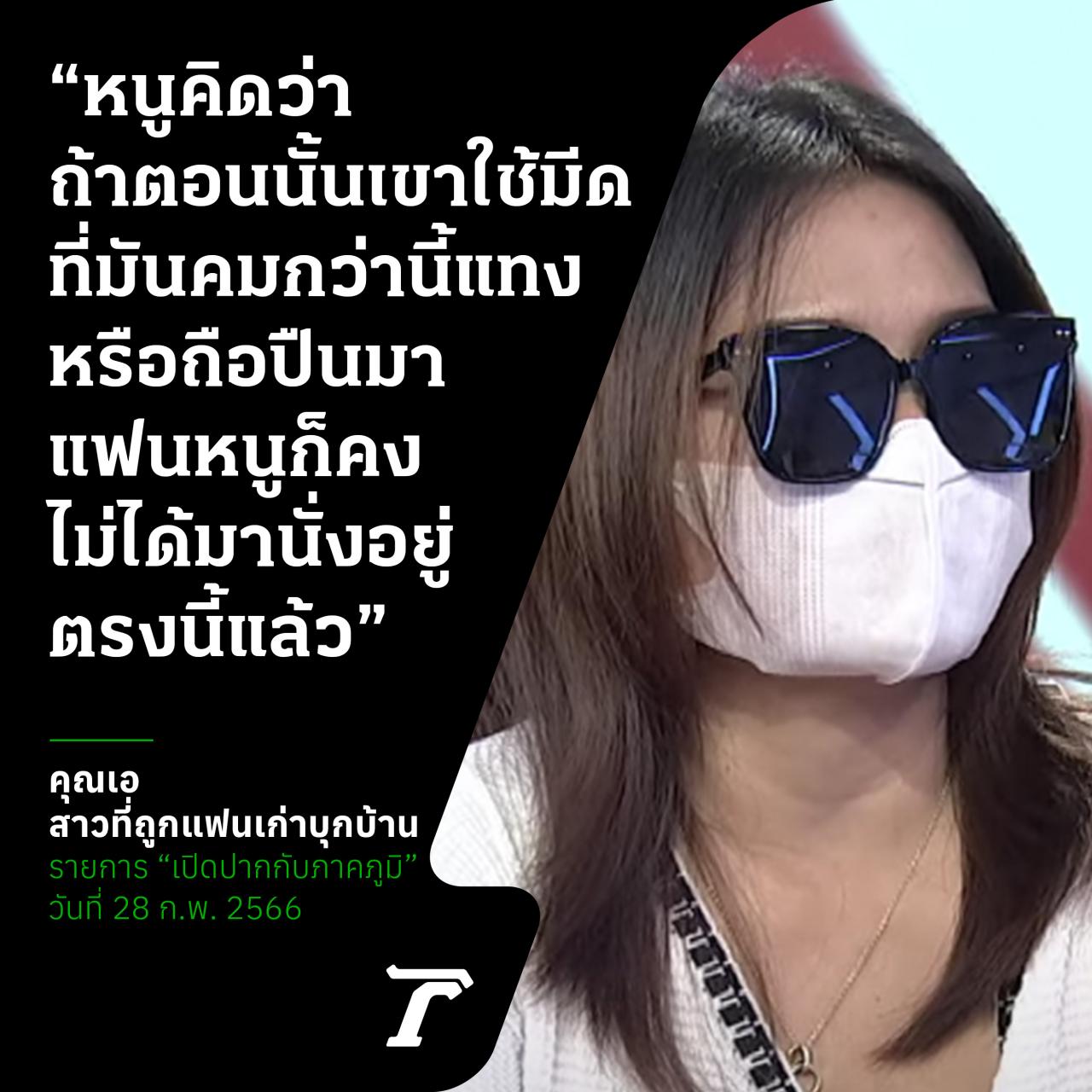 เมื่อเวลา 15.30 น. วันที่ 28 ก.พ. 66 ในรายการ "เปิดปากกับภาคภูมิ" ทางไทยรัฐทีวี ช่อง 32 ดำเนินรายการโดย นายภาคภูมิ พันธุ์สถิตย์ ได้พูดคุยกับคุณเอ คุณบี และคุณเอกภพ เหลืองประเสริฐ เจ้าของเพจสายไหมต้องรอด ในประเด็น หนุ่มแฟนเก่าหึงโหด ยกพวกไล่ตีแฟนใหม่ถึงในบ้าน หลังจากเลิกรากันไปแล้วกว่าครึ่งปี