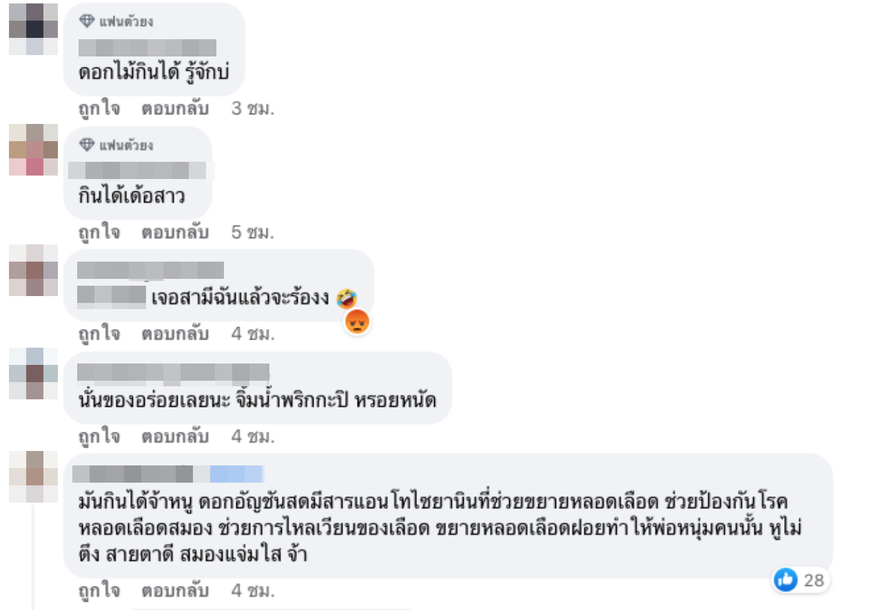ทำให้เวลาต่อมามีคนเข้ามาแสดงความคิดเห็นกันอย่างร้อนแรง รวมทั้งมีเพจต่างๆ แชร์ออกไปจำนวนมาก โดยส่วนใหญ่ระบุดอกอัญชันนั้นสามารับประทานได้ และยังมีประโยชน์, มันกินได้จ้าหนู ดอกอัญชันสดมีสารแอนโทไซยานินที่ช่วยขยายหลอดเลือด ช่วยป้องกันโรคหลอดเลือดสมอง ช่วยการไหลเวียนของเลือด ขยายหลอดเลือดฝอย ทำให้พ่อหนุ่มคนนั้น หูไม่ตึง สายตาดี สมองแจ่มใส.