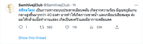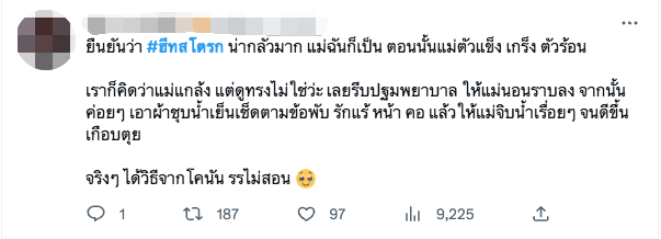 ทำให้หลายคนเริ่มตระหนักถึง "ภาวะฮีตสโตรก" หรือ "โรคลมแดด" ว่าเป็นเรื่องอันตรายที่ไม่ควรมองข้าม พร้อมแชร์ประสบการณ์ของคนในครอบครัวที่ป่วยจากโรคนี้ ทั้งยังแนะนำให้ความรู้เกี่ยวกับวิธีการรักษาและป้องกันภาวะดังกล่าว พร้อมกันติด แฮชแท็ก #ฮีทสโตรก และ #ฮีตสโตรก จนขึ้นติดเทรนด์ในทวิตเตอร์ภายในเวลาอันรวดเร็ว.