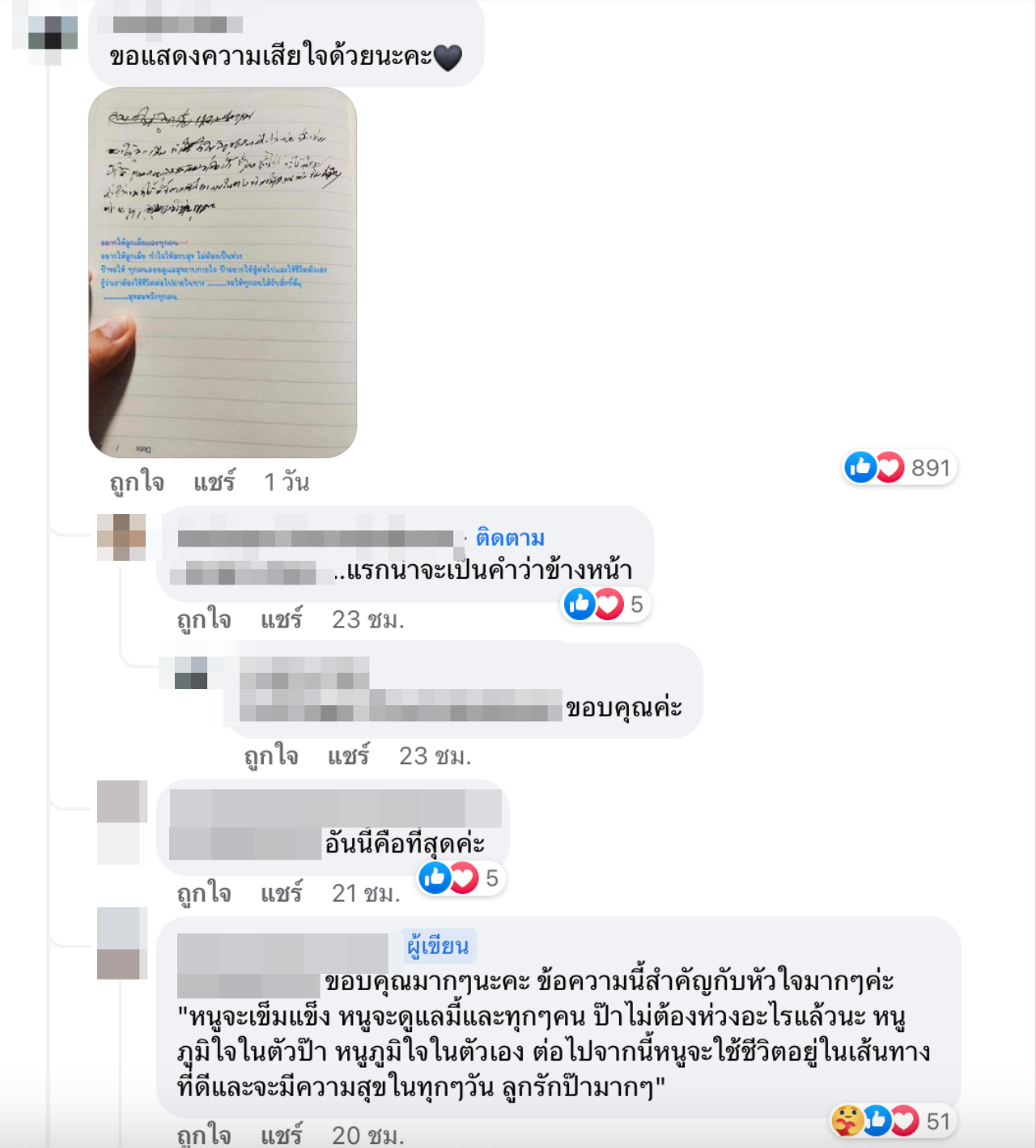 อย่างไรก็ตามในเวลาต่อมาได้มีคนเข้ามาช่วยเจ้าของโพสต์แปลข้อความคำสั่งเสียของคุณพ่อจำนวนมาก โดยใจความคร่าวๆ สามารถแปลได้ว่า เป็นการบอกให้ลูกเมียทำใจให้สบาย ไม่ต้องเป็นห่วง ขอให้ทุกคนมีความสุขต่อไป ซึ่งเรื่องราวดังกล่าวทำให้หลายคนที่เข้ามาชมต่างรู้สึกซาบซึ้งใจอย่างมาก.