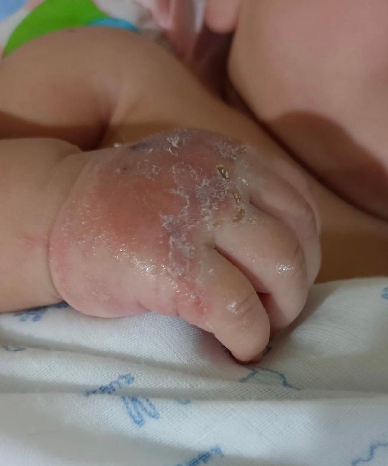 เช้าวันที่ 18 เม.ย. ตนเองเดินทางกลับมาจากชลบุรีเข้าไปดูลูก พบว่ามือของลูกชายบวมมากขึ้นทั้ง 2 ข้าง จึงได้แจ้งพยาบาลขอให้ถอดเข็มน้ำเกลือที่คาไว้ เมื่อถอดออกพบว่ามือของลูกชายบวมเป่งเหมือนผิวหนังแตก เป็นแผลพุพอง อักเสบ บวมแดง มีกลิ่นคาวรุนแรงคล้ายน้ำหนอง พยาบาลได้นำผ้าก๊อชมาปิดแผลเอาไว้ แล้วบอกให้รอแพทย์เจ้าของไข้มาตรวจ