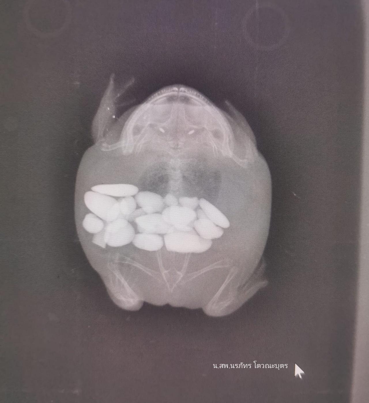ทั้งนี้ "น้องกบเป็นสัตว์อีกชนิดหนึ่งที่เราพบการกินสิ่งแปลกปลอมอยู่บ่อยๆ เช่น กรวด ต้นไม้น้ำปลอม หรือสิ่งประดับตู้ต่างๆ ที่มีขนาดเล็กกว่าปากน้อง ต้องระมัดระวังในการเลี้ยงกันด้วยนะครับ ไม่งั้นอาจจะต้องร้องปวดหัวจังได้ครับ ข้อมูลโดย นสพ.นรภัทร โตวณะบุตร"