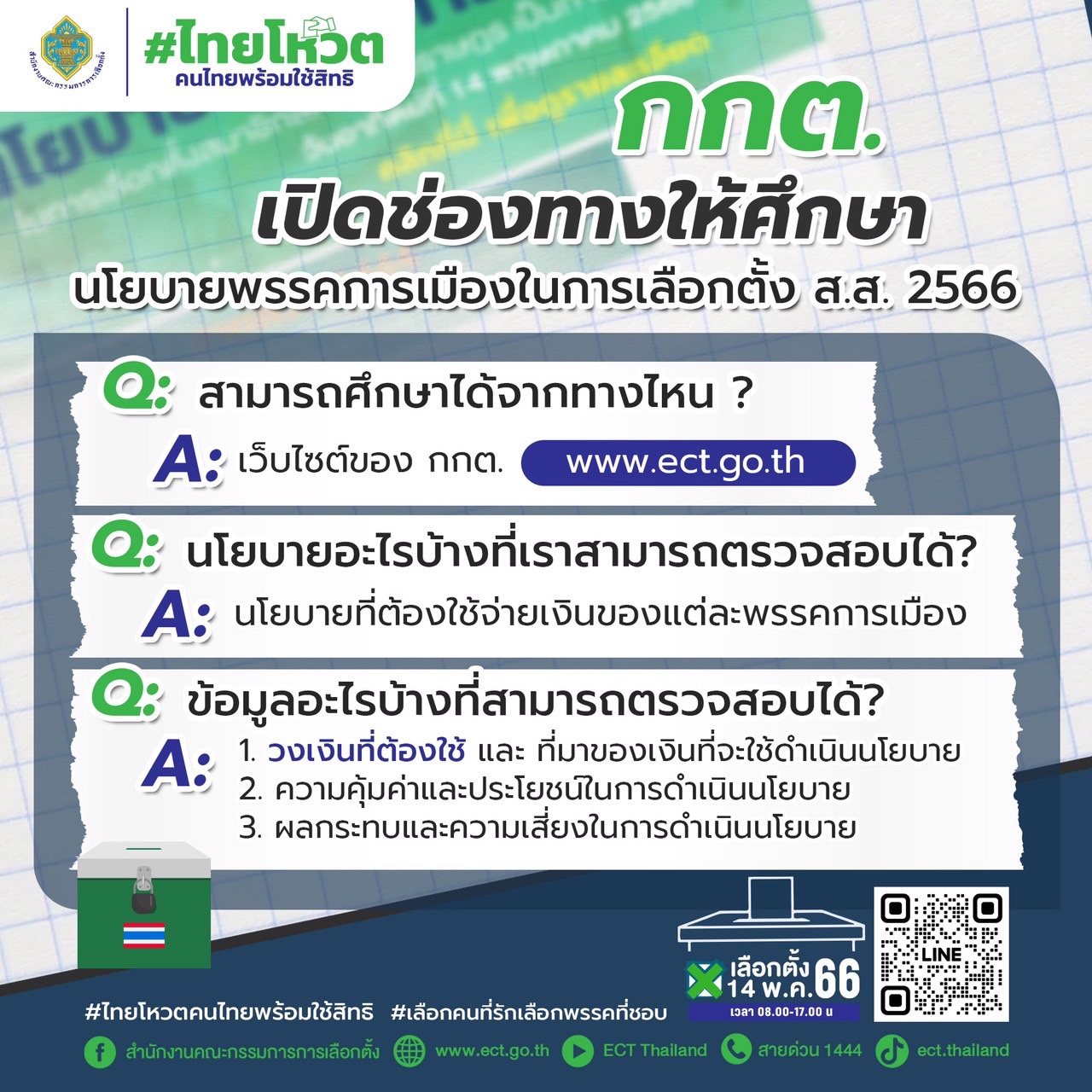 สามารถ Add Friends (เพิ่มเพื่อน) เพื่อติดตามข้อมูลข่าวสารเกี่ยวกับการเลือกตั้ง 2566 ได้ที่ LINE Official Account : ECT Thailand https://lin.ee/jETxaeu