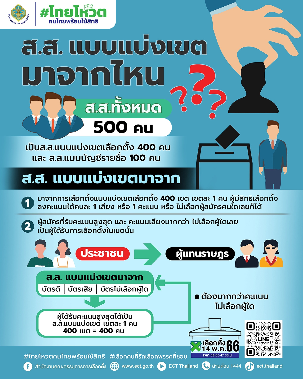 เลือกตั้งครั้งนี้มี ส.ส.แบบแบ่งเขต 400 คน และ ส.ส.แบบบัญชีรายชื่อ 100 คน เลือกได้ทั้งคนที่รัก และพรรคที่ชอบ