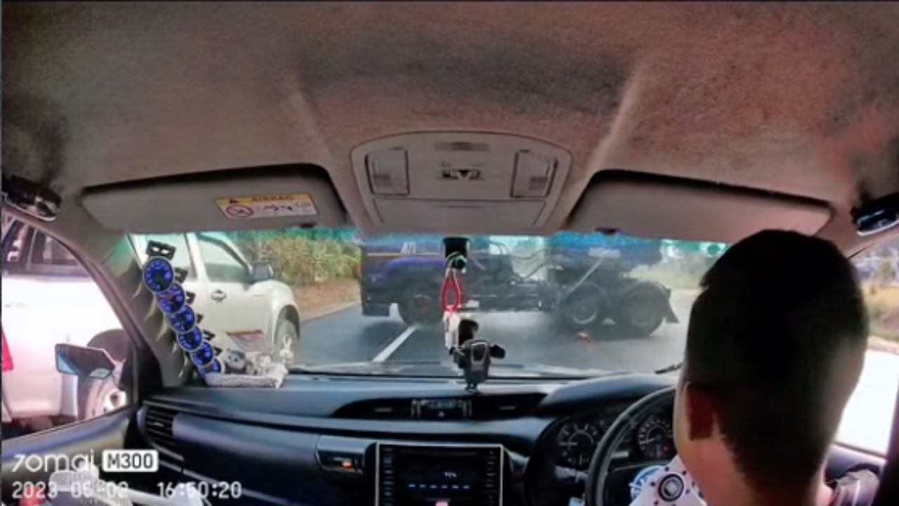 อย่างไรก็ตาม เจ้าของคลิปได้เผยกับผู้สื่อข่าวถึงเหตุการณ์ที่เกิดขึ้นว่า ทีแรกตนก็ขับมาดีๆ แล้วมาแวะจอดซื้อขนมเพราะหิว ซื้อของเสร็จ แล้วแกะขนมกิน จะออกจากหน้าปั๊มที่แม่จัน จังหวัดเชียงราย ตนสังเกตซ้ายขวาว่าง ก็ออกไป แต่ไม่รู้รถหัวลากเบรกแล้วลื่น บวกกับถนนฝนเพิ่งตกเสร็จ ก็เลยเห็นตามคลิป แต่ต่างคนต่างปลอดภัย ไม่มีอะไรเสียหาย