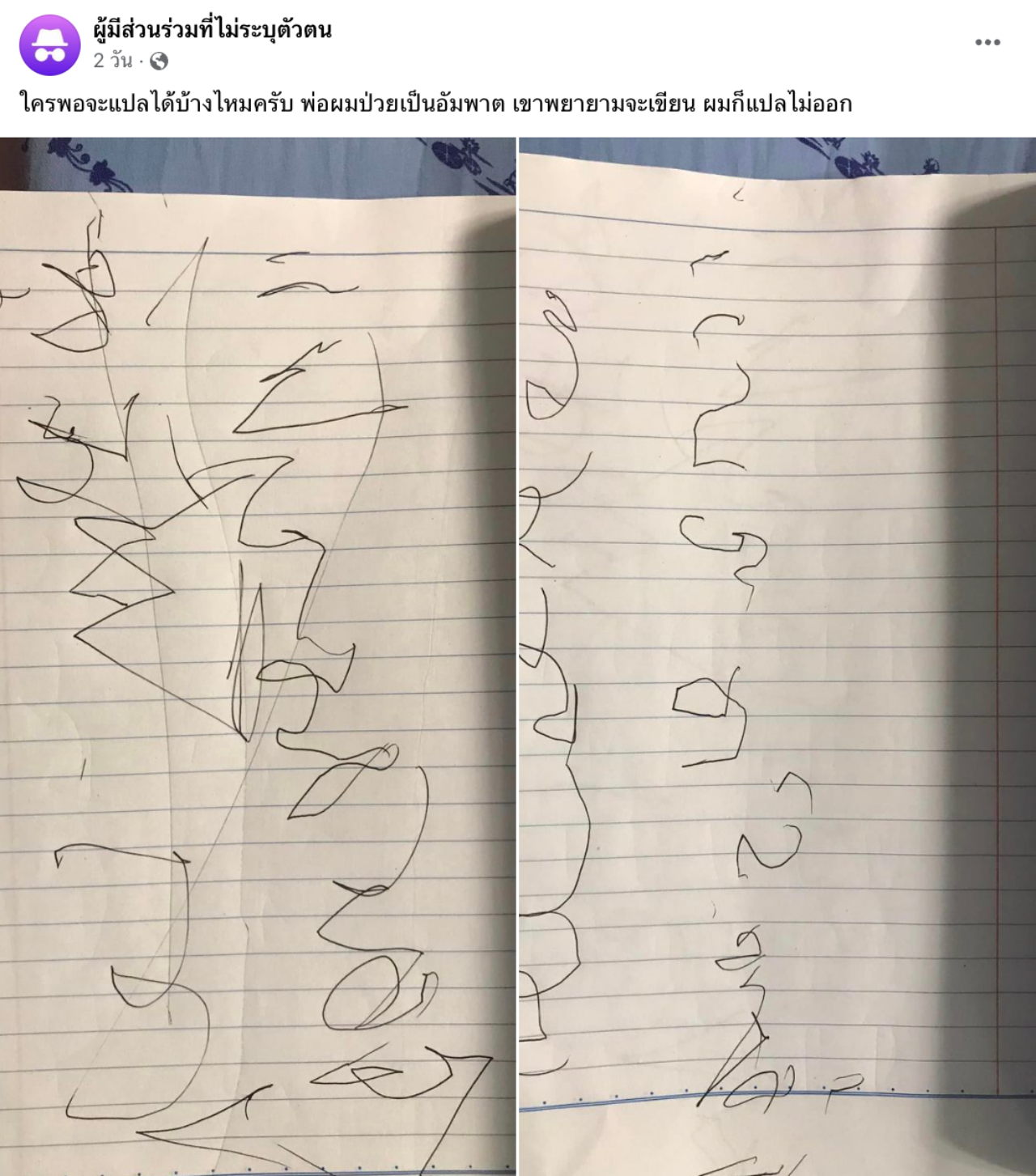 วันที่ 7 พฤษภาคม 2566 มีรายงานว่า โลกออนไลน์ได้ให้ความสนใจเรื่องราวในกลุ่มเฟซบุ๊ก ความรู้รอบตัว ที่มีสมาชิกอยู่ 3.5 แสนราย ได้มีผู้ใช้เฟซบุ๊กรายหนึ่งได้โพสต์ภาพลายมือของผู้ป่วยอัมพาต พร้อมข้อความขอความช่วยเหลือ ระบุว่า "ใครพอจะแปลได้บ้างไหมครับ พ่อผมป่วยเป็นอัมพาต เขาพยายามจะเขียน ผมก็แปลไม่ออก"