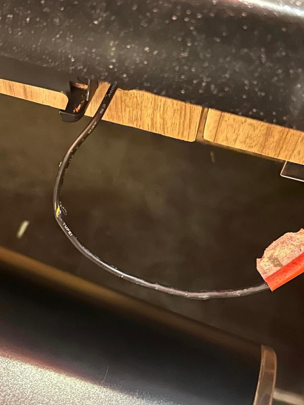 แล้วคือมือเราไปแตะโดนสายพานมันช็อตทันที ตอนแรกคิดว่า ช็อตจากสายพาน แต่พอมาดูที่โต๊ะ สายไฟรีโมตปรับอุณภูมิหม้ออยู่ที่ใต้โต๊ะ เราเลยเห็นว่าสายไฟขาด (ตามภาพ) แถมมือขวาที่เราวางไว้ที่ตัก ก็มีรอยแดง แสบมาก เราตกใจมาก เลยรีบบอกพี่ชายที่ไปตักซูชิมา เขาไม่เห็นเราตอนช็อต เพราะไปตักของกินมาพอดี